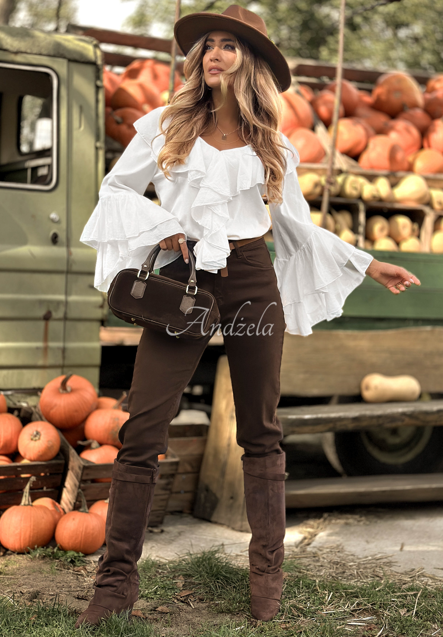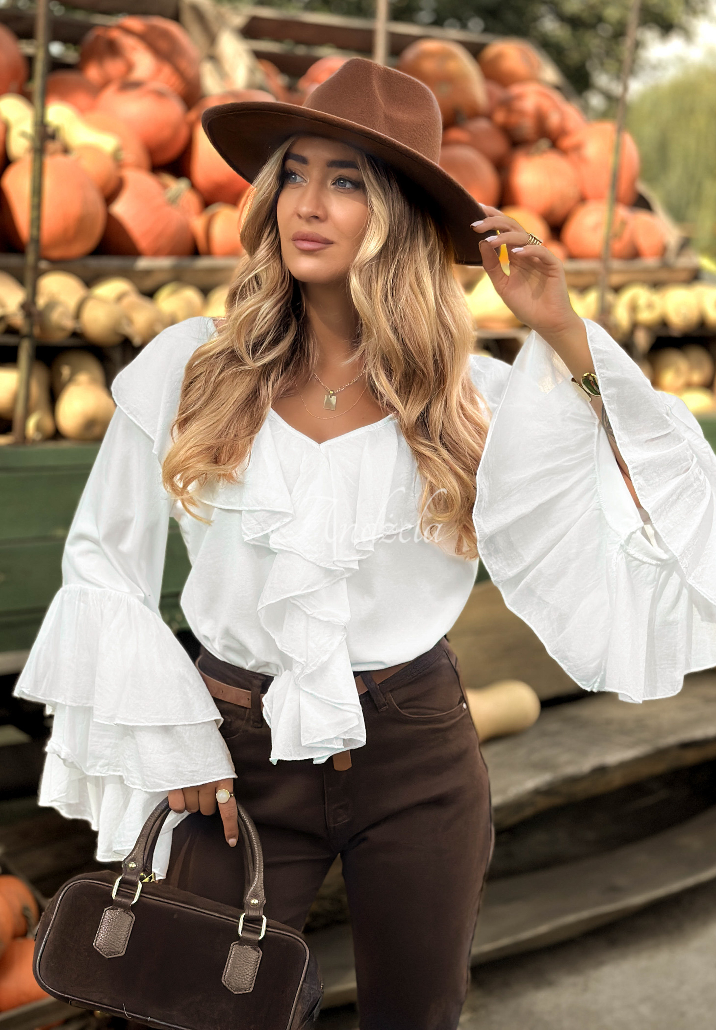 Eine Bluse aus elastischem Baumwollstoff. Das Modell besticht durch auffällige Rüschen an der Vorderseite und den Ärmeln.