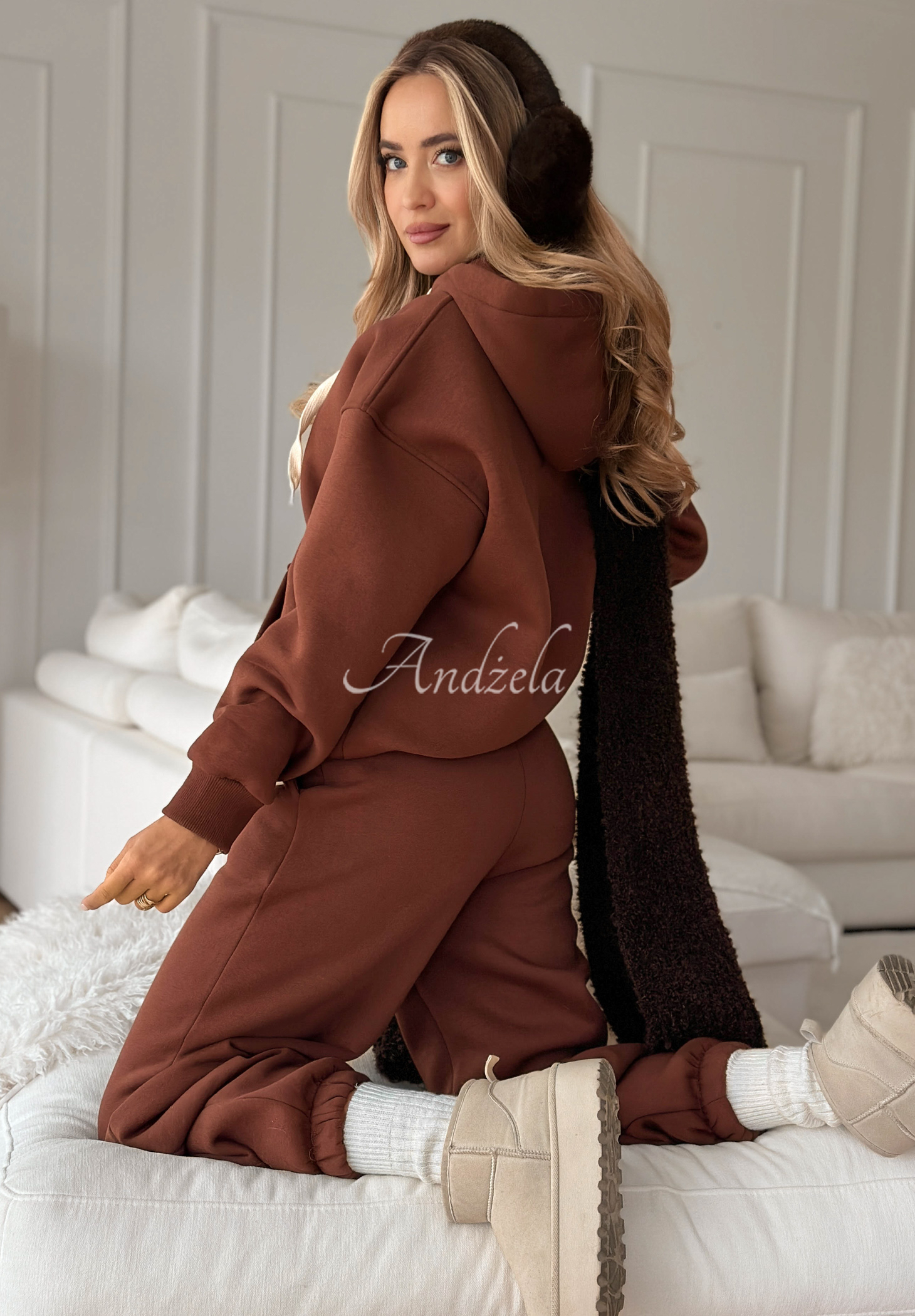 Isoliertes Sweatshirt-Set aus Baumwolle. Das Sweatshirt besticht durch sein klassisches Design mit Kapuze und Kängurutasche. Die Hose hat Fronttaschen und einen elastischen Bund. Die Hosenbeine sind mit Rippbündchen versehen.