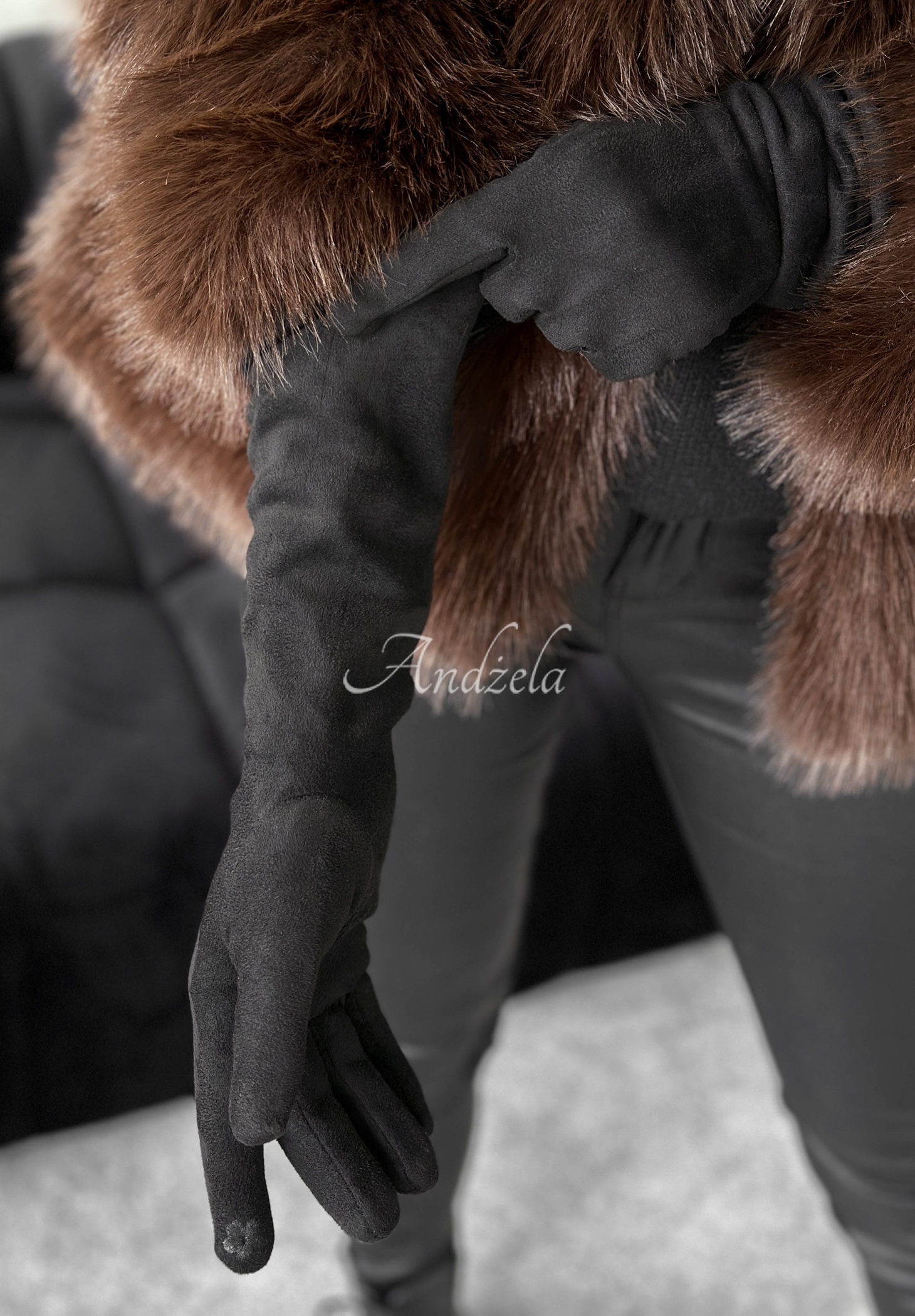 Lange Handschuhe aus Wildlederimitat. Das Produkt ist innen leicht gepolstert. Zeigefinger und Daumen sind zusätzlich mit speziellen Applikationen ausgestattet, die eine bequeme Nutzung des Smartphones ermöglichen.