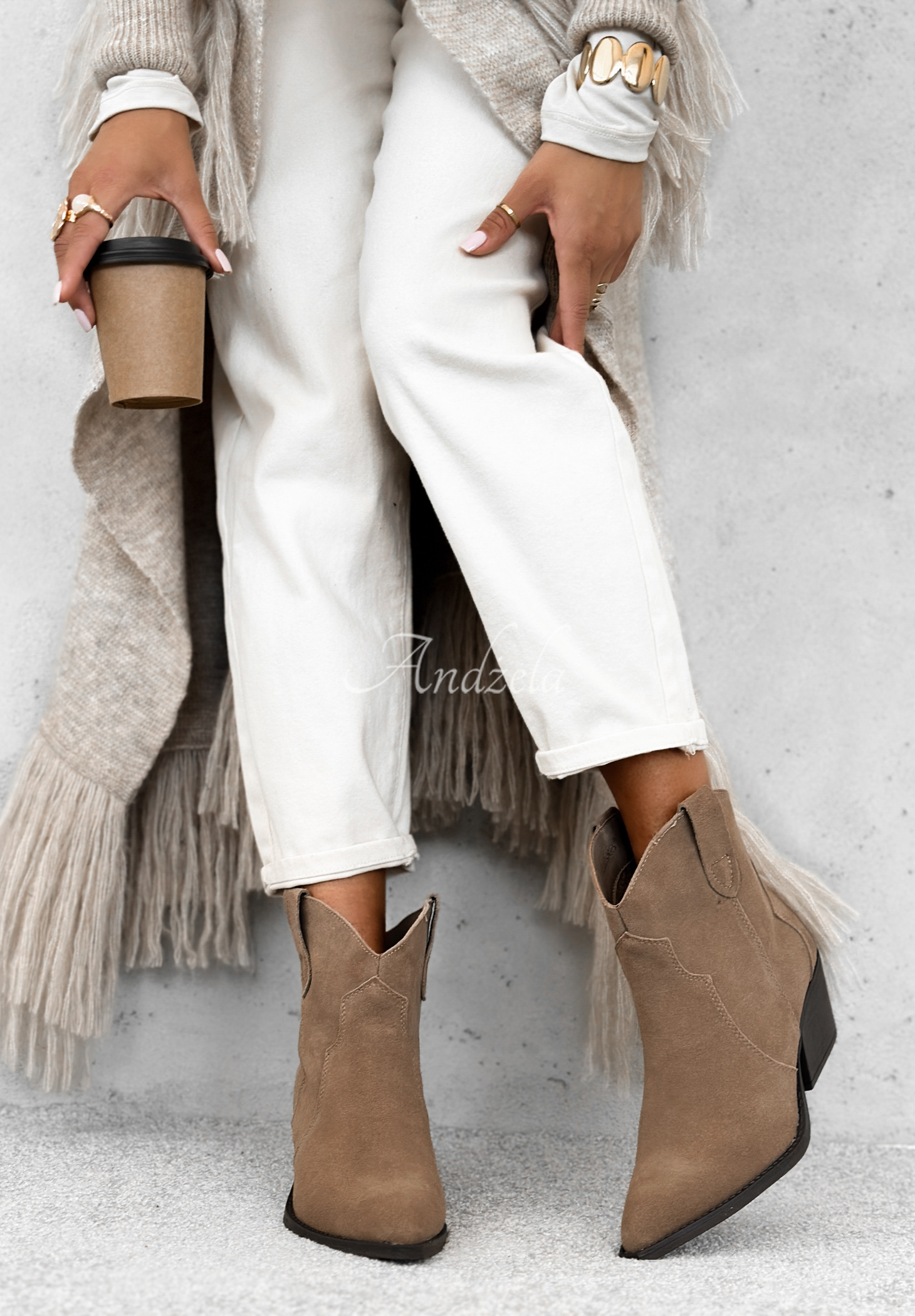 Wildlederstiefeletten aus natürlichem Leder. Diese Cowboystiefel haben eine spitze Zehenpartie und einen schrägen Absatz. Dieses Modell ist leicht gefüttert und hat keinen Verschluss.