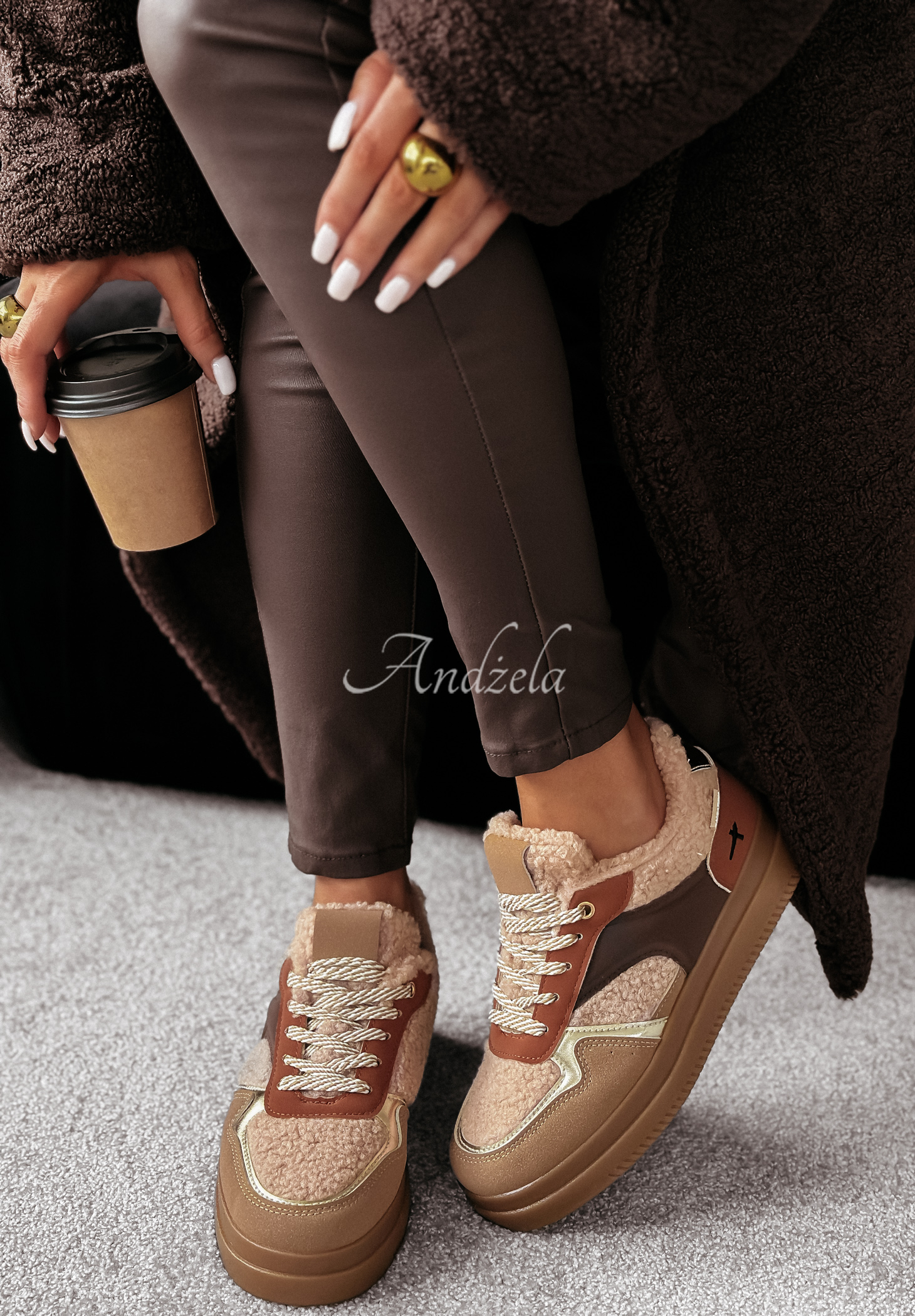 Isolierter Sneaker mit weichem Schaffellfutter. Mit goldenen und Lederakzenten. Dieses Schnürmodell hat eine abgerundete Spitze und eine erhöhte Gummisohle.