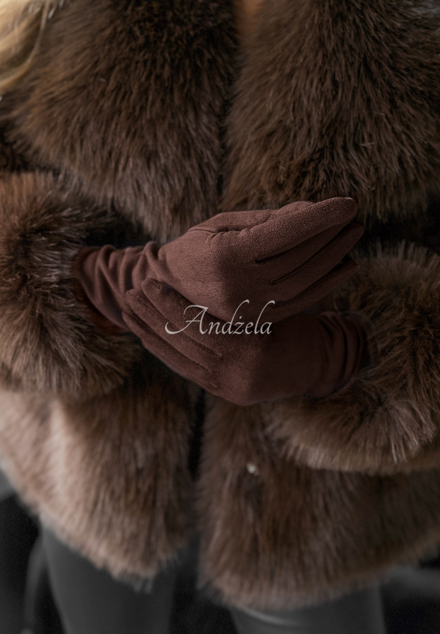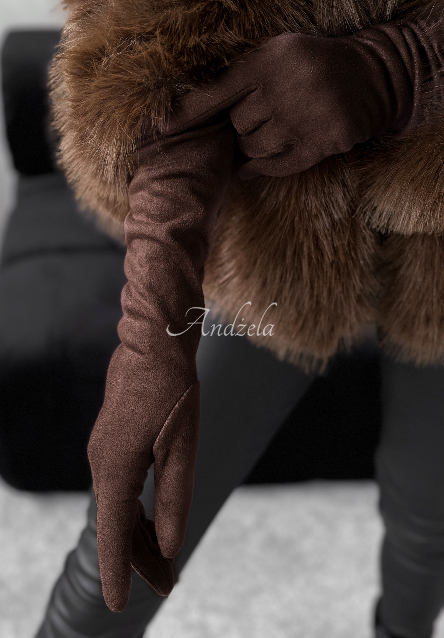 Lange Handschuhe aus Wildlederimitat. Das Produkt ist innen leicht gepolstert. Zeigefinger und Daumen sind zusätzlich mit speziellen Applikationen ausgestattet, die eine bequeme Nutzung des Smartphones ermöglichen.