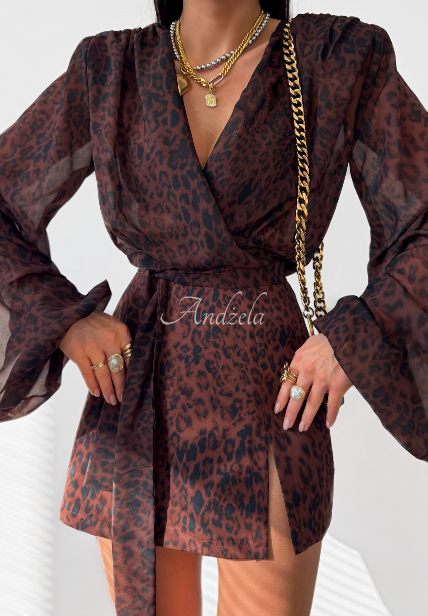 Viskosebluse mit modischem Leopardenmuster. Aus leichtem, transparentem Stoff gefertigt, besticht sie durch eine auffällige Binde am Saum und konturierte Schulterpolster. Die langen Ärmel sind mit Gummizug versehen.