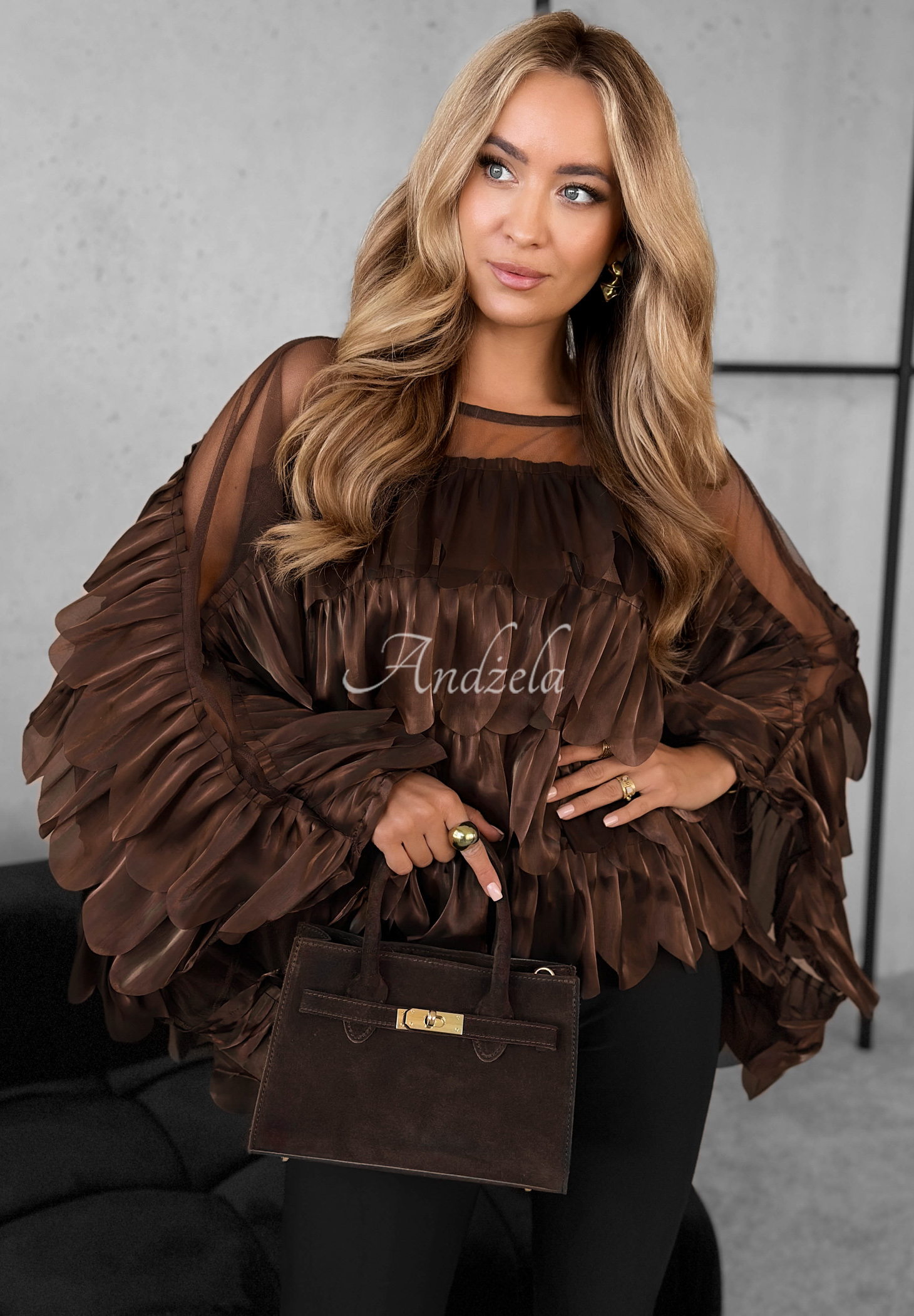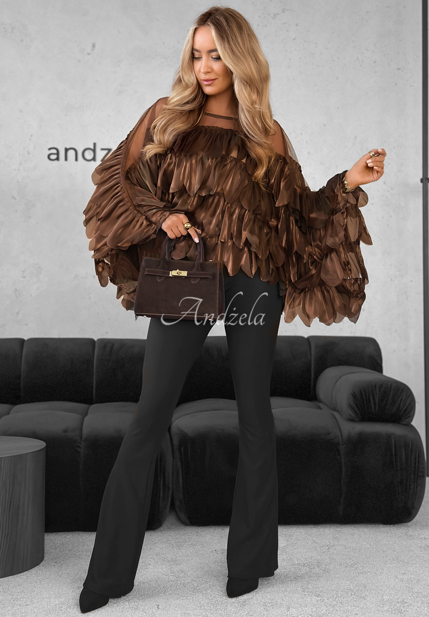 Eine Viskosebluse aus Tüllstoff mit fließenden Rüschen. Dieses kürzere Modell zeichnet sich durch einen Rundhalsausschnitt und weite Ärmel aus.* Nicht elastisches Material* Rüschen* Rundhalsausschnitt* Weite Ärmel* Kürzere Passform