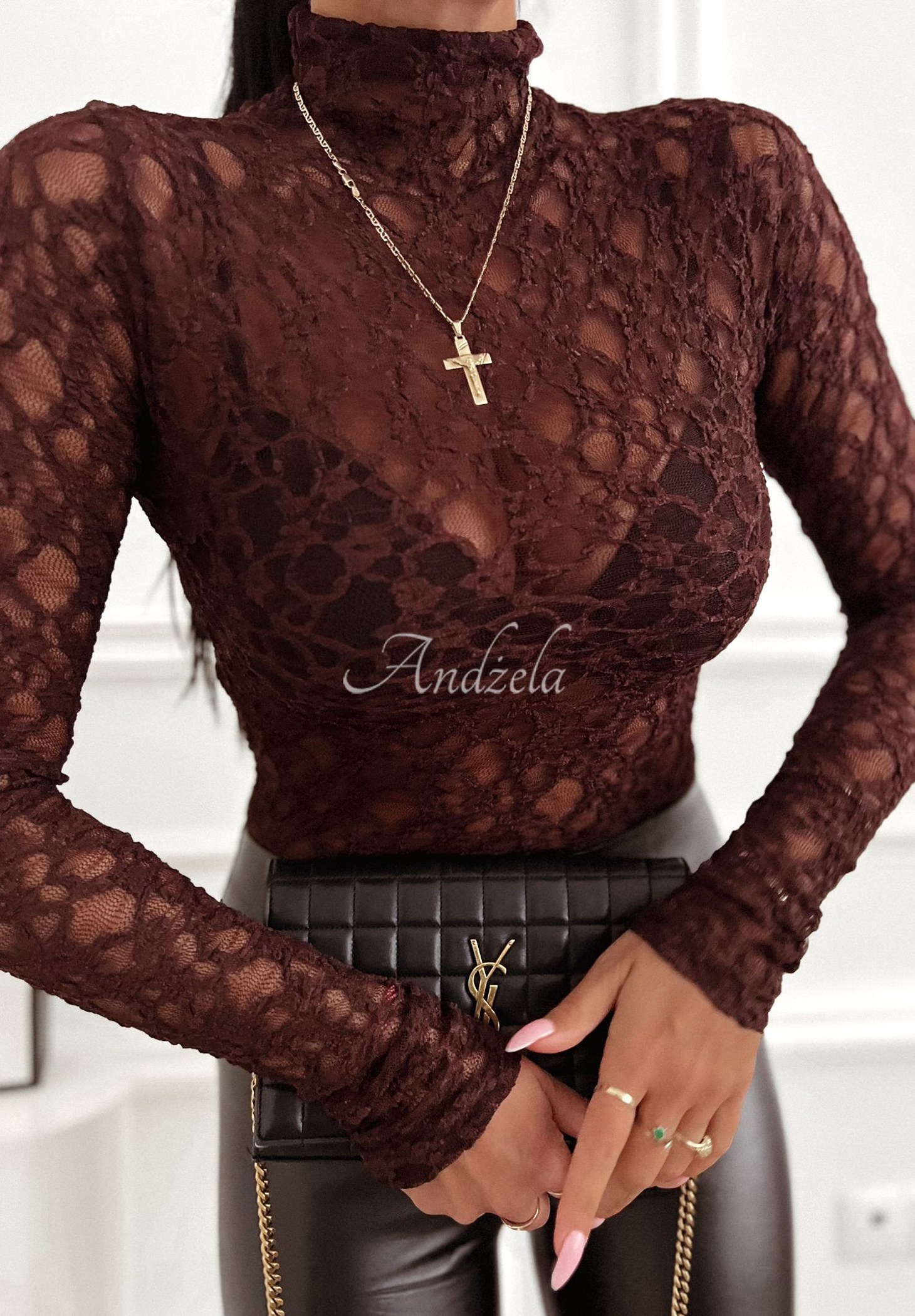 Eine klassische Bluse mit langen Ärmeln und Stehkragen. Aus weicher, transparenter Spitze.* Elastisches Material* Transparente Spitze* Lange Ärmel* Stehkragen
