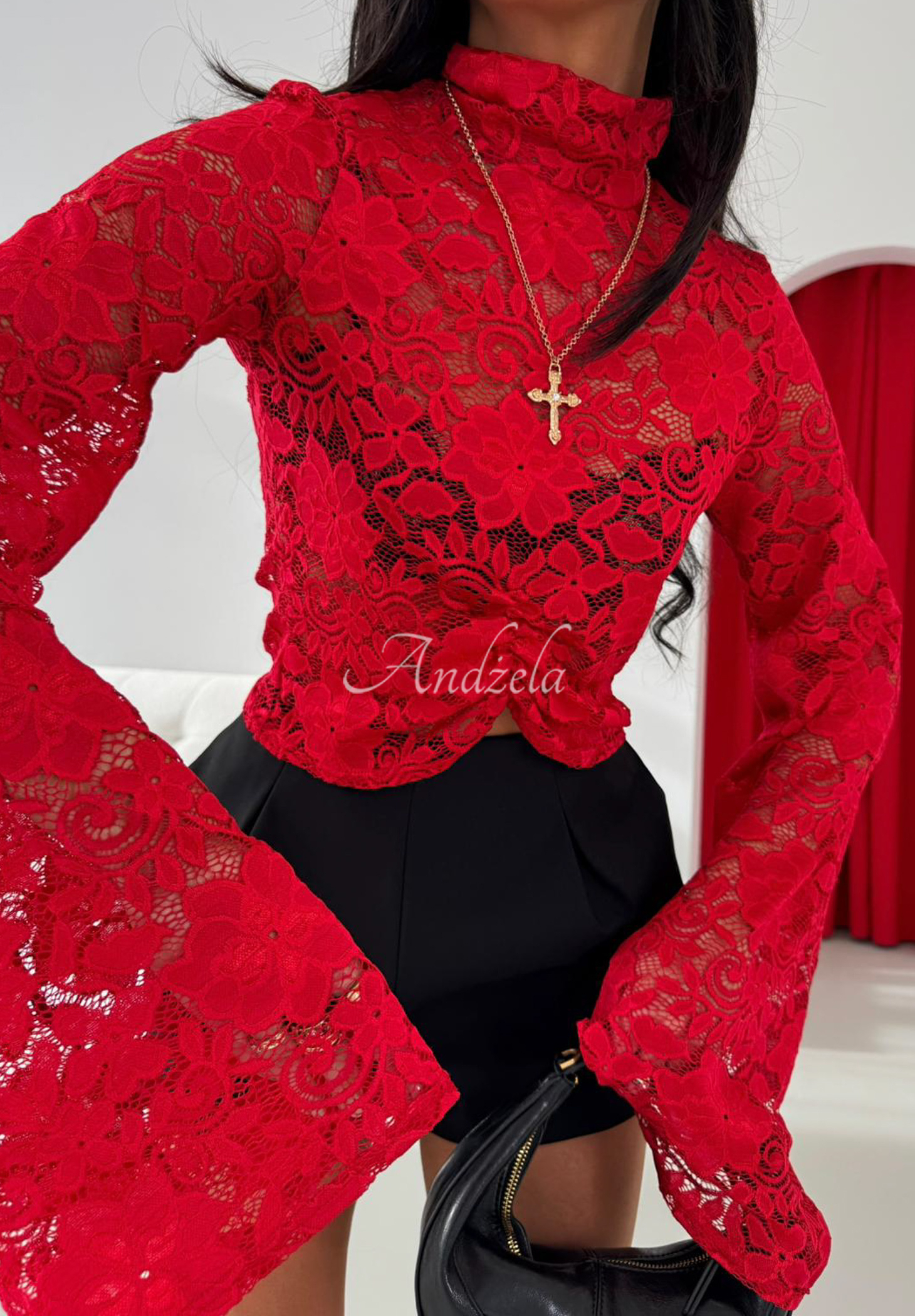 Spitzenbluse aus transparentem Viskosematerial. Das Modell hat einen Stehkragen und auffällige Raffungen sowie lange Ärmel, die am Abschluss ausgestellt sind.