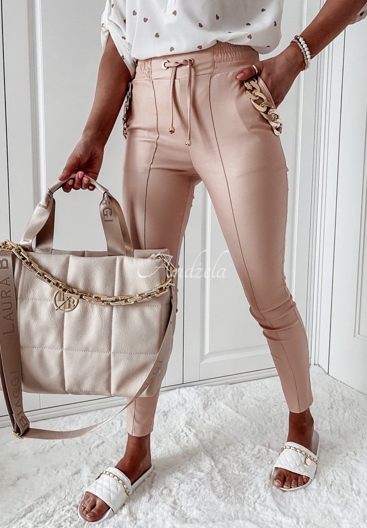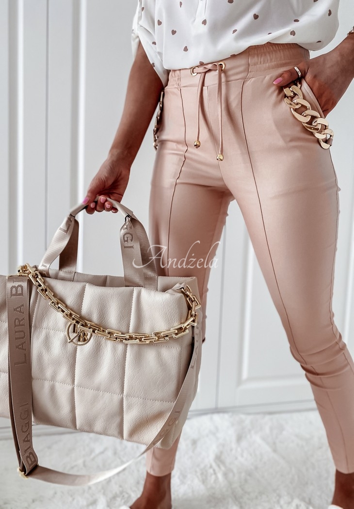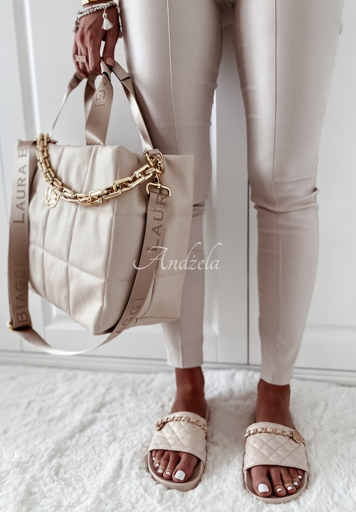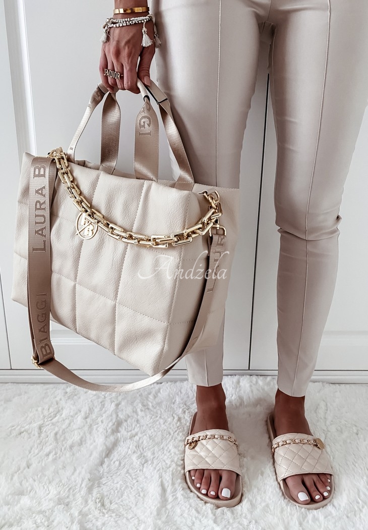 Elegant and very packable handbag made of quilted material, it will certainly be a great addition to many stylings. The model has a decorative gold chain, which gives it character. The bag has handles and an adjustable strap. Inside it has three pockets in which one is zippered.