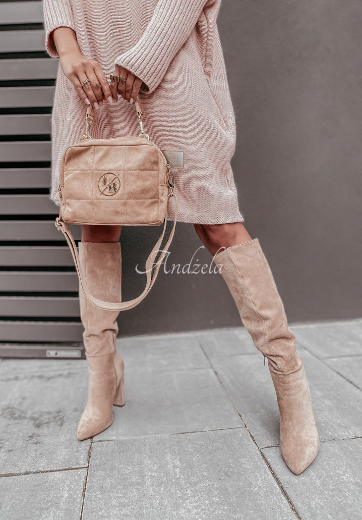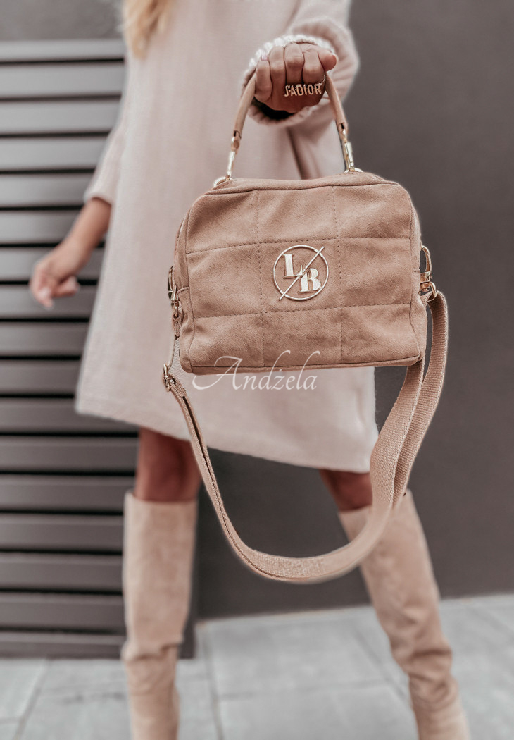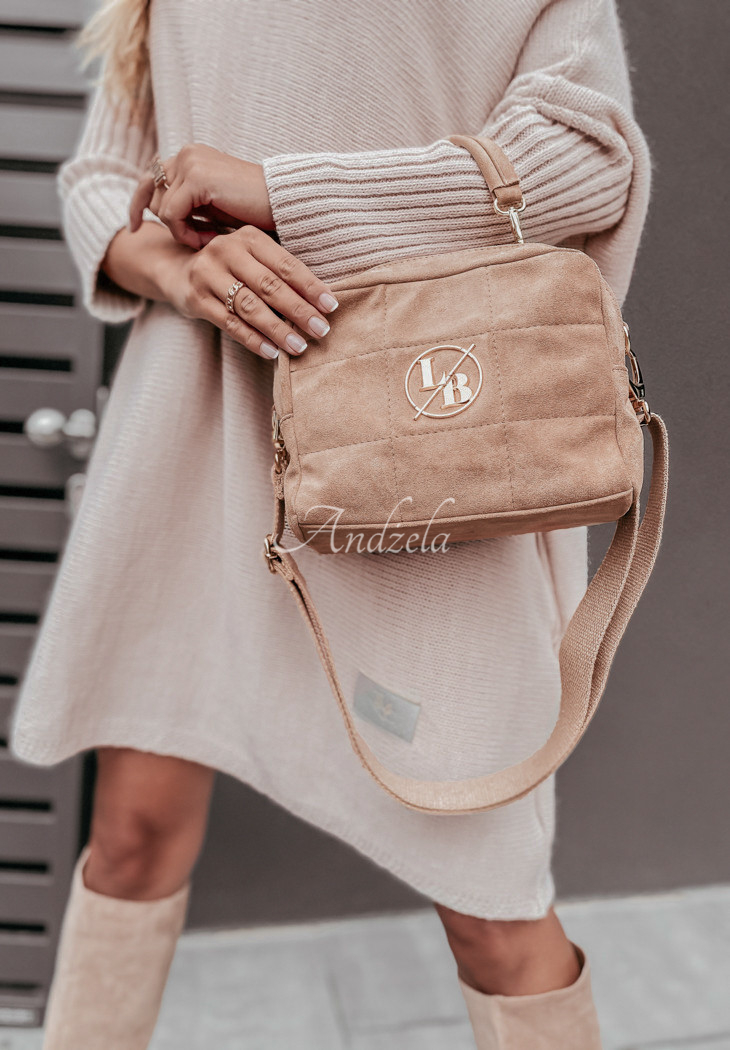 A rounded purse, made of imitation suede. Model with two zippered compartments. Two additional pockets were placed inside, and one zippered pocket on the outside. The bag has a handle and a long, detachable, adjustable strap. This model is a great choice for both casual and elegant styling.