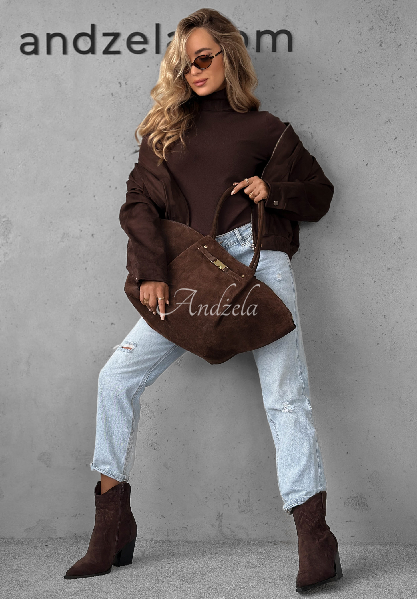 A suede handbag with decorative straps, made of high-quality natural leather. It is a single-compartment model with a clasp and zippers. It has two pockets located inside, including one zippered one. The whole bag is completed with gold details.
