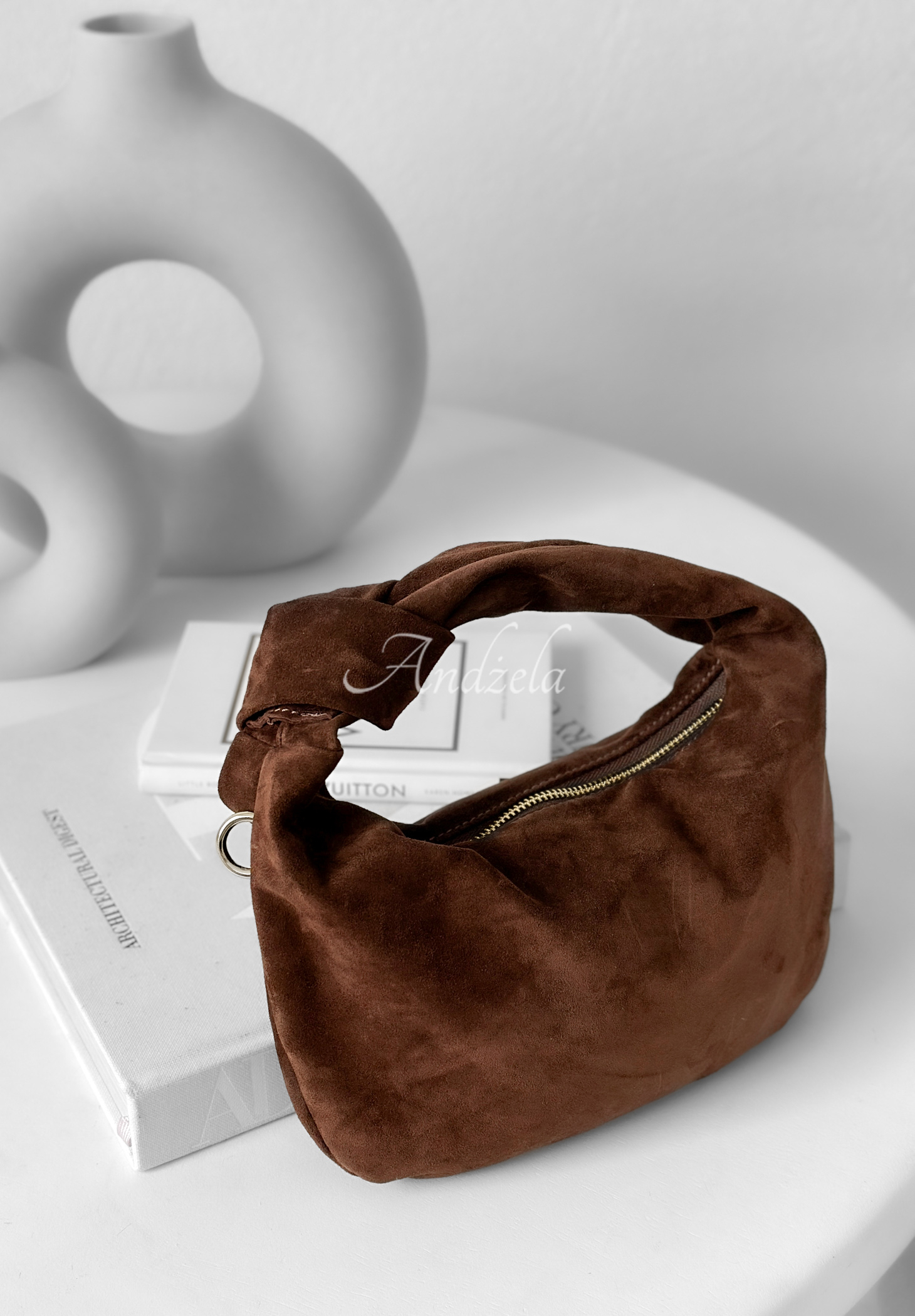 A suede handbag made of high-quality natural leather. It is a single-compartment model with a zipper closure. It has a handle, an adjustable strap and a single pocket inside. The whole is complemented by gold details.