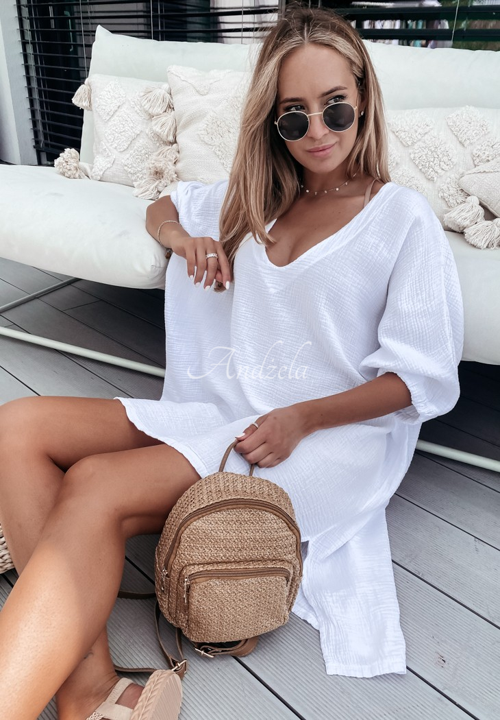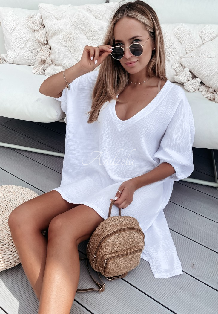 A muslin tunic with an asymmetrical cut is a proposition that should necessarily find its way into every closet. The model has a deep-cut neckline, which makes the whole look extremely feminine. The blouse will be a fantastic choice when creating everyday styling, which will undoubtedly look great, but also provide you with comfort.