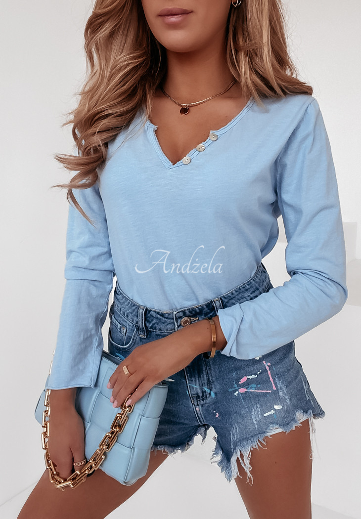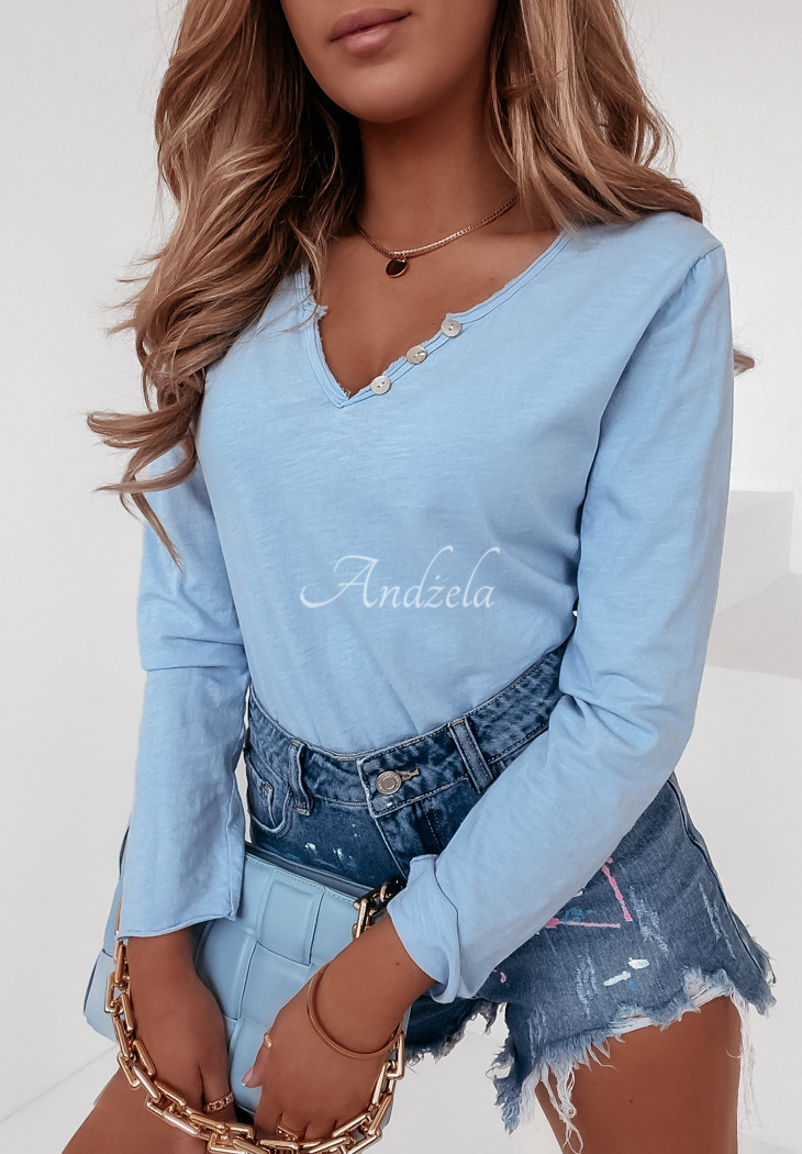 Basic long-sleeve blouse is a great base for everyday styling. The model is raw-finished, has a delicate neckline with a small slit and decorative buttons. This proposal will present itself fantastically when paired with jeans. The product is made of high quality material, and is available in several color variants.
