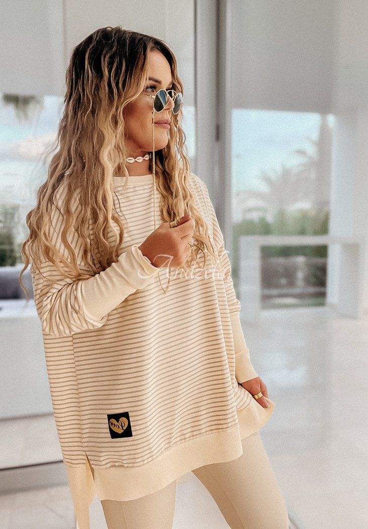 A striped blouse with a round neckline and a minimalist patch. The asymmetrical cut model has a ribbed hem at the neckline, sleeves and bottom.