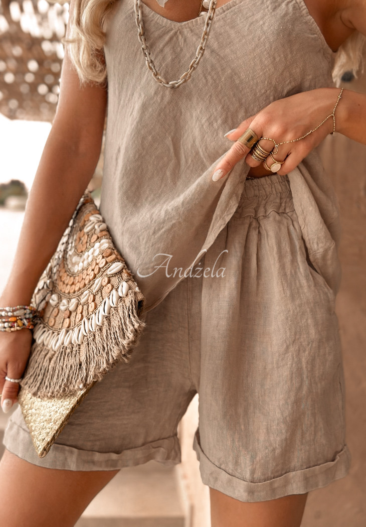 A lightweight top made of linen fabric is an option that will fit perfectly into any summer closet. It's a strapless model with ties, and features a v-neck on both the front and back. The whole thing makes a great basic for comfortable styling on hot days.