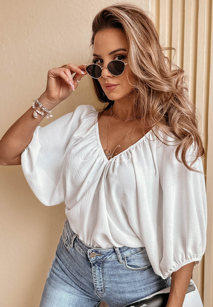 The lightweight blouse is a proposition that will work well in both casual and elegant loos. The model, with a bat cut, is distinguished by wide 1/2 length sleeves, which are flowy and finished with ribbed cuffs. Both in the front and back there is a cut-out neckline, giving the whole a feminine touch.