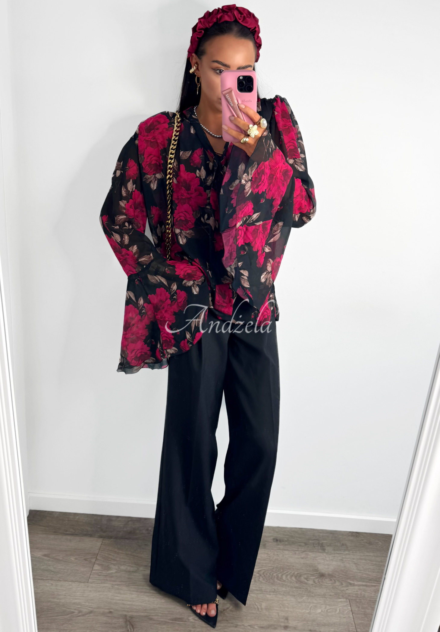 Viscose blouse in floral print, made of light, transparent material. It is a proposal, distinguished by a striking binding at the neck, as well as long sleeves ending in a wide, airy ruffle. On its shoulders there are shape-giving cushions.