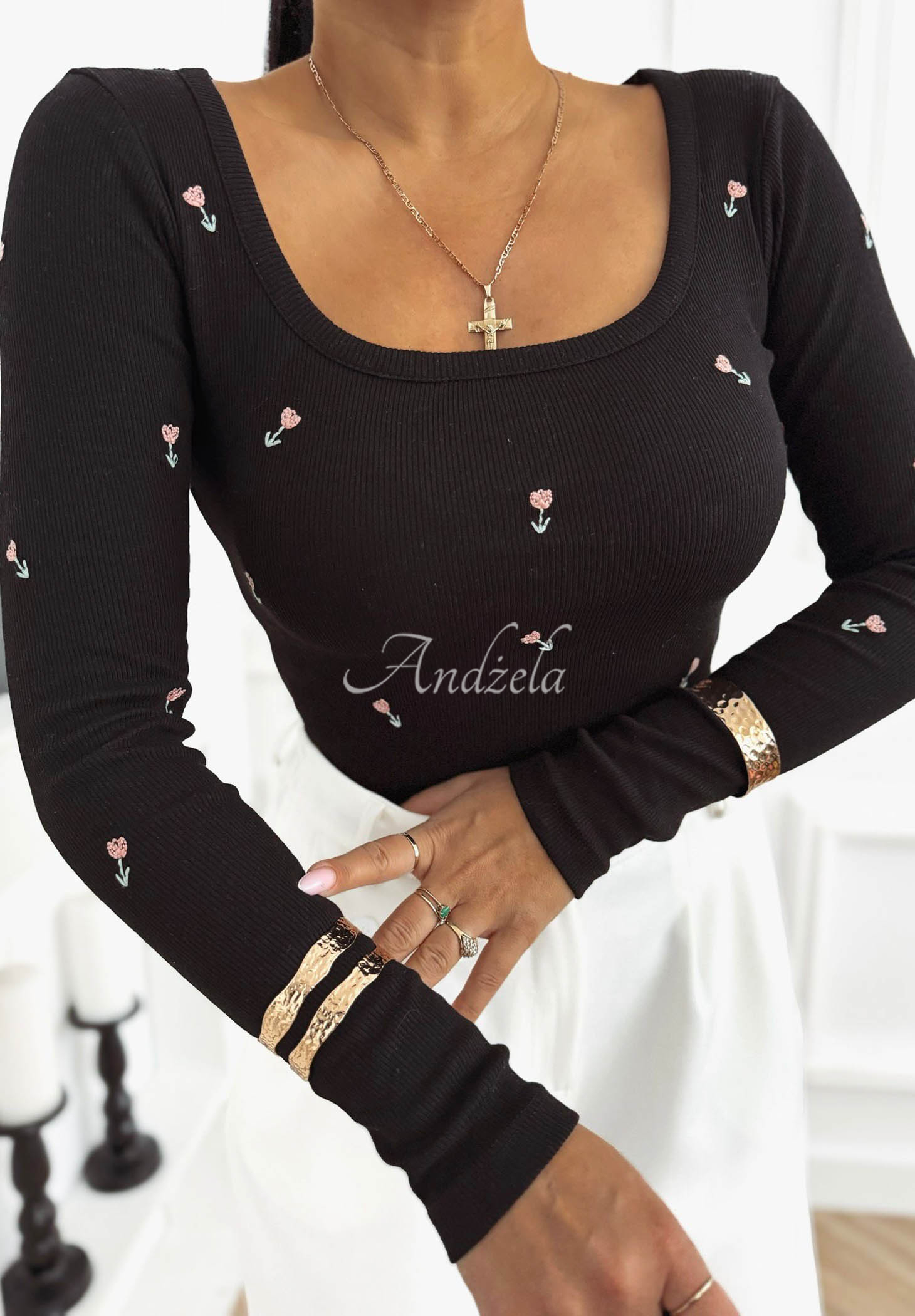 A ribbed blouse made of elastic cotton fabric. This design features minimalist embroidered flowers. It has a deeper, rounded neckline and long sleeves.