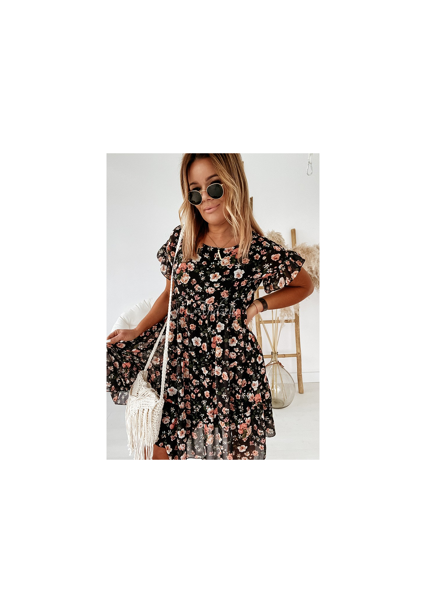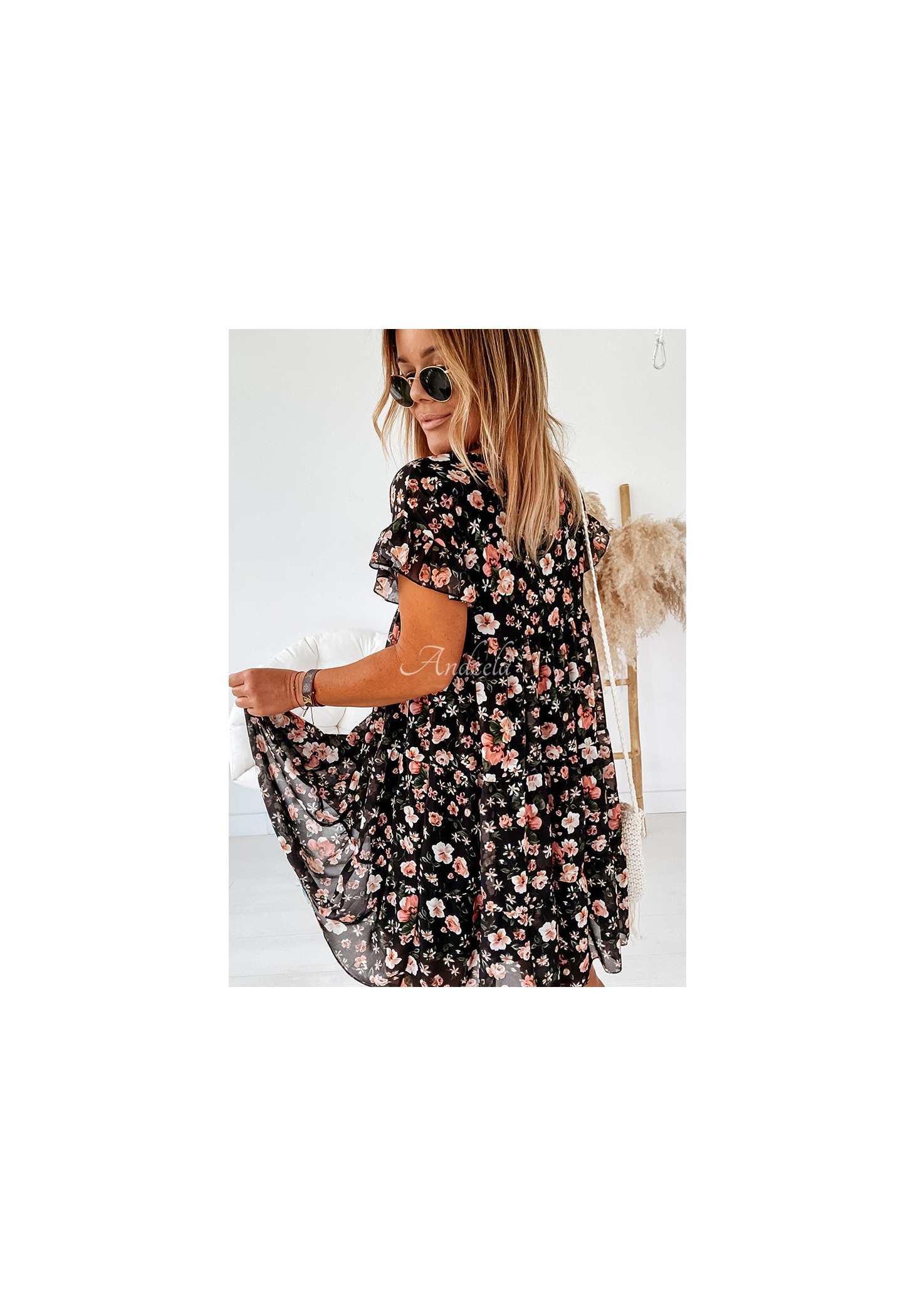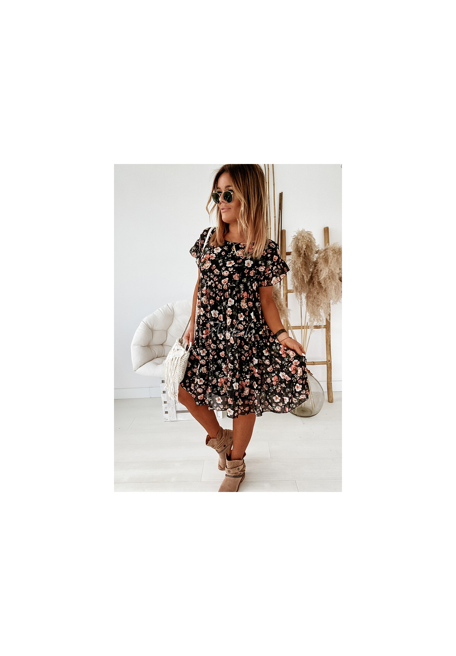 A floral dress made of airy fabric is a great choice for spring-summer styling. The model is distinguished by sleeves with a delicate frill and horizontal stitching. Slightly flared hem gives the whole a girlish look. It will perfectly present itself in styling with boots, as well as sandals. Available in several color versions.