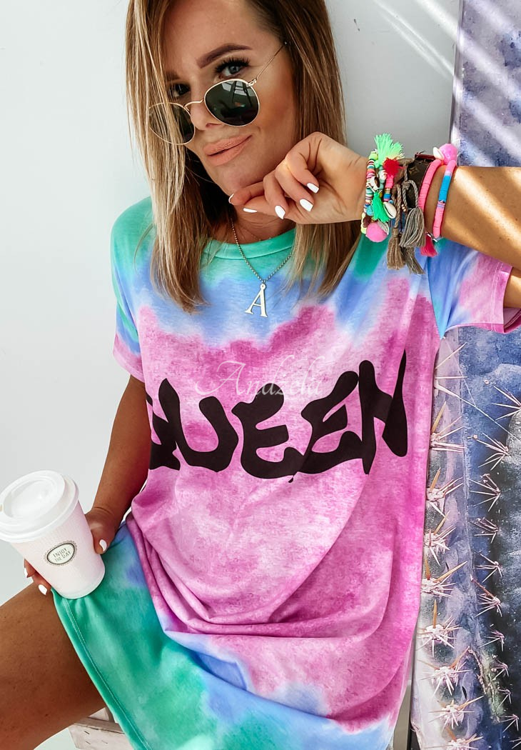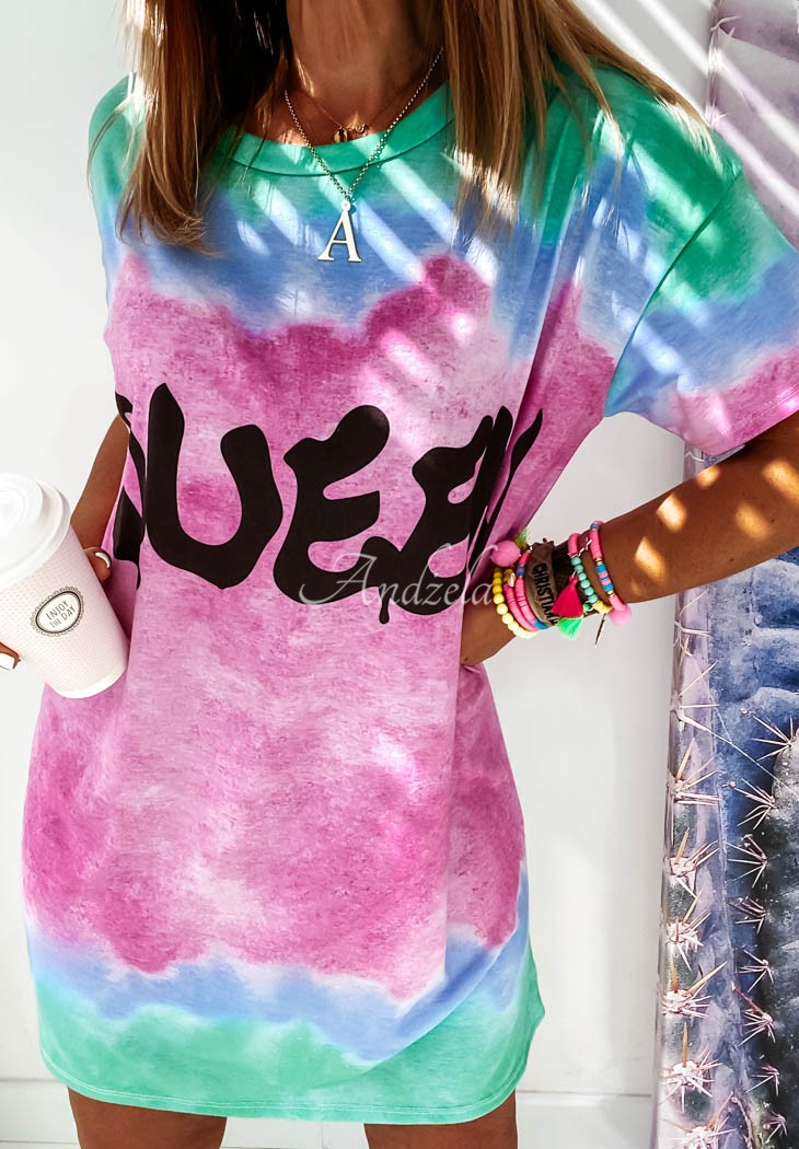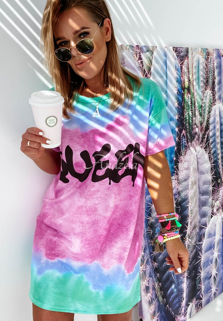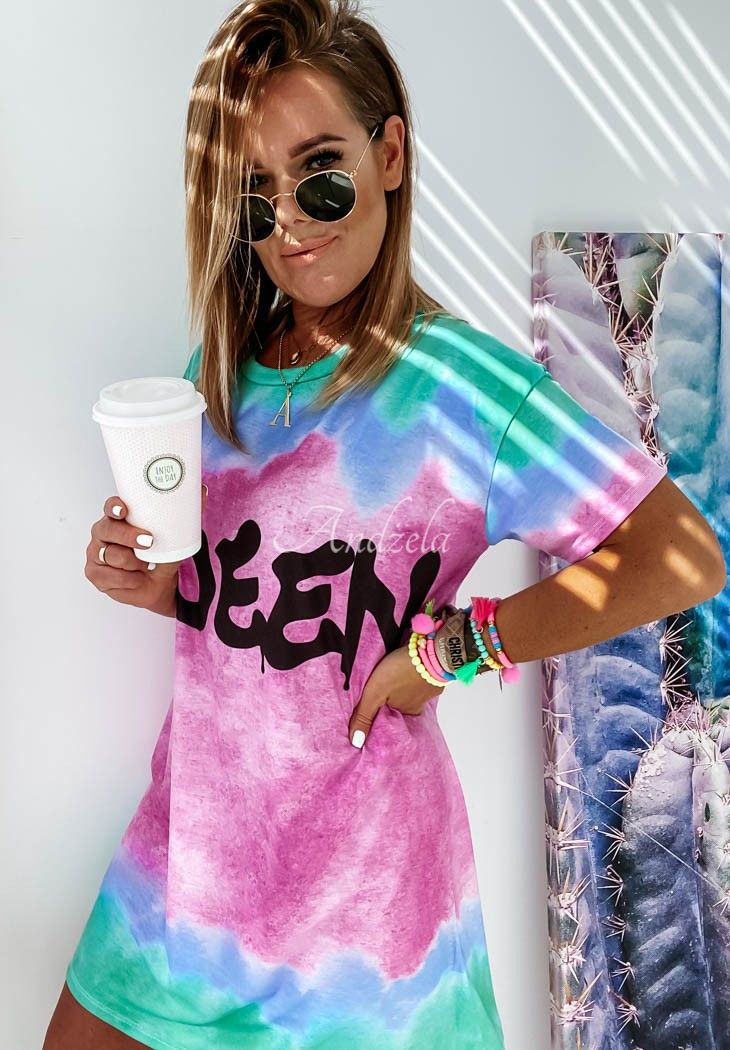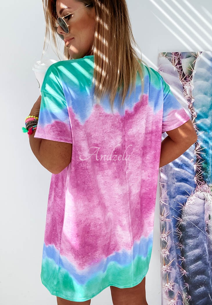 Exceptional oversize cut dress with ombre effect and print on the front. This is a great option for the spring-summer season. Fantastic for everyday, comfortable styling, which will undoubtedly present itself originally.