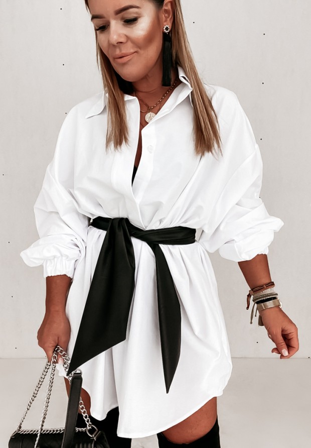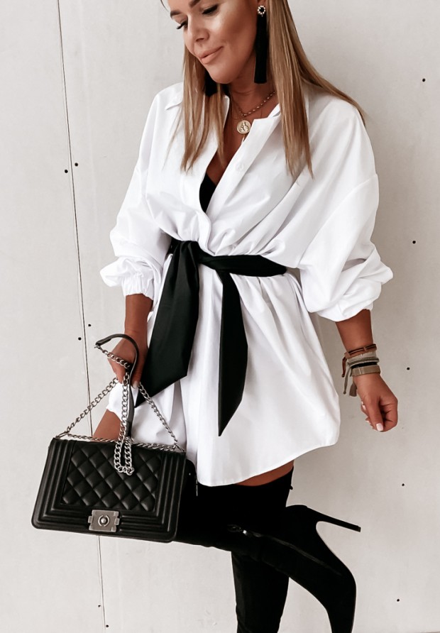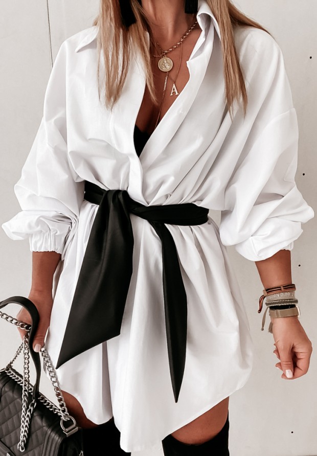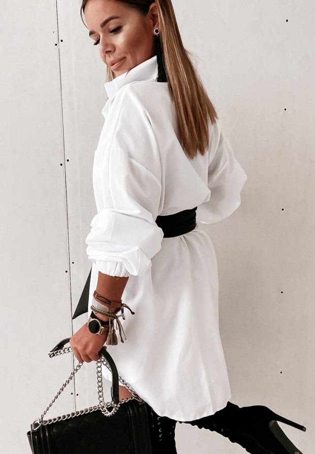 Longer, slightly asymmetrical shirt with pockets on the sides. The model has an elastic band at the sleeves and a belt at the waist. Fits elegant as well as sporty shoes. Very fashionable and comfortable cut. Design by ANDŻELA!