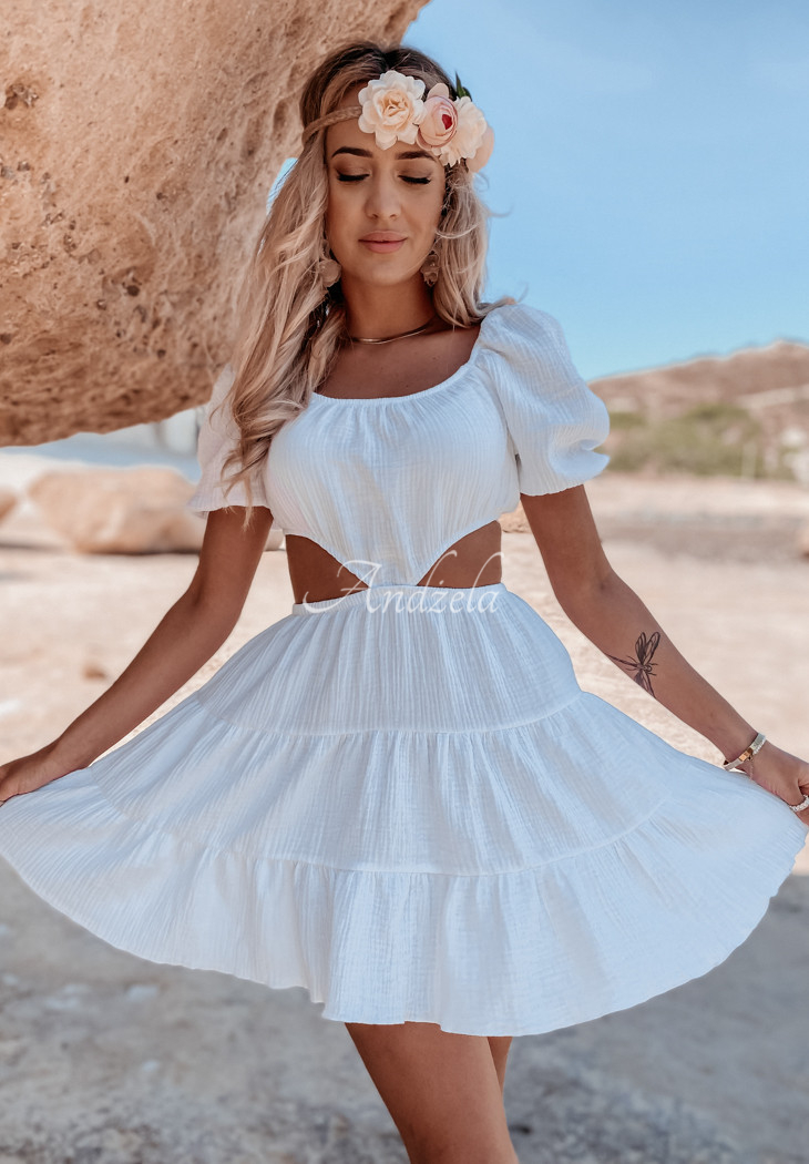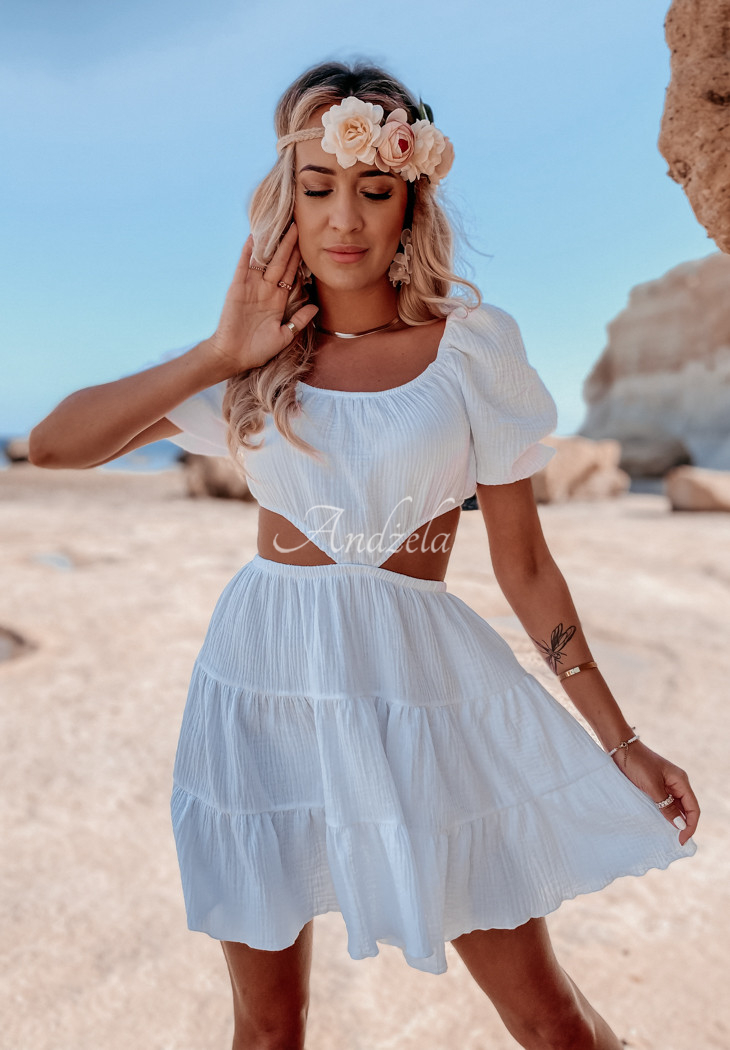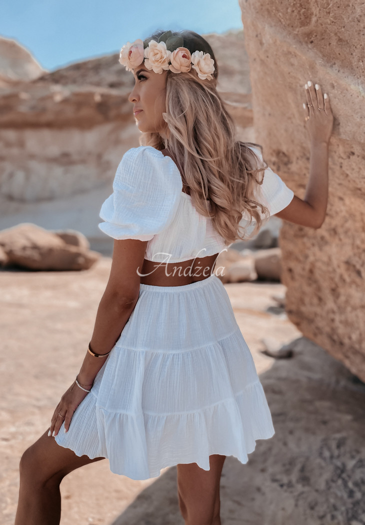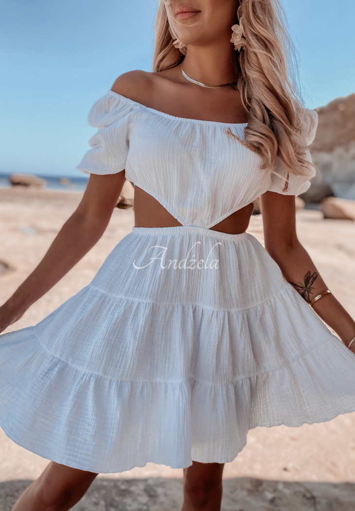 A lightweight muslin dress is an ideal choice for the summer season. The model consists of a skirt and a short top, joined together at the front. The sleeves are finished with ribbed cuffs, at the bottom there is a girly frill. This proposal is a great base for everyday styling on hot days. The product is made of high quality material, it is available in several color variants.