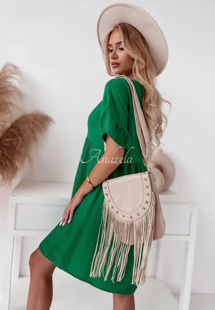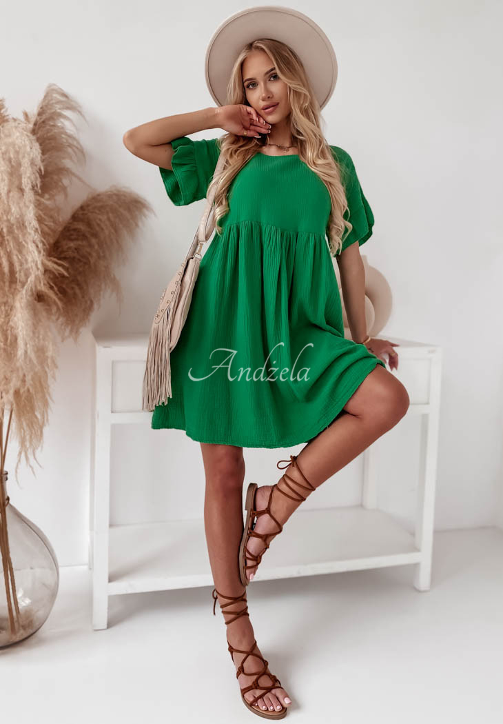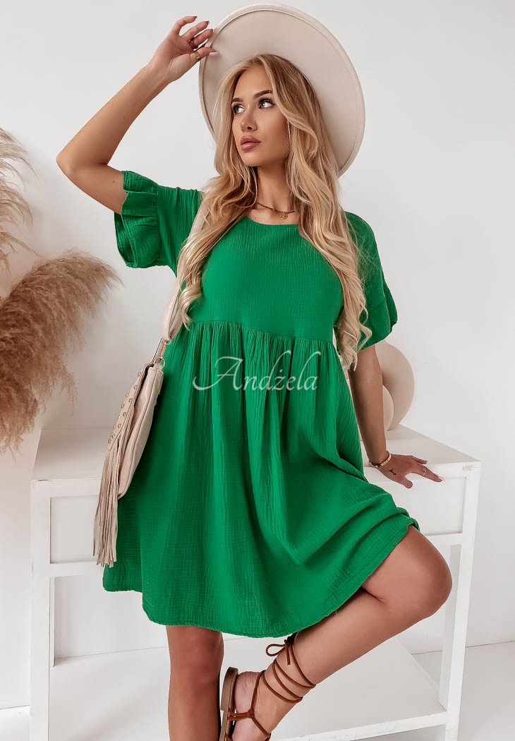 This extremely feminine dress made of high-quality muslin fabric is the perfect choice for hot summer days. The model has short sleeves finished with a delicate frill. The dress has a cut under the bust, which will perfectly emphasize and highlight your waist. Pair it with sandals or sneakers. Available in many colors.