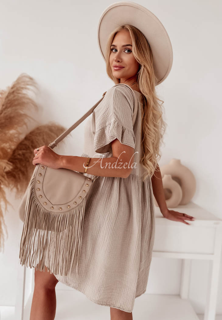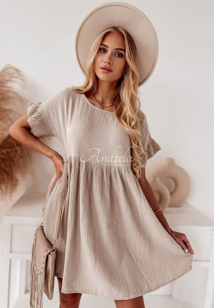 An extremely girly dress made of high-quality muslin fabric is a perfect choice for hot summer days. The model has short sleeves, which are finished with a delicate frill. The dress has a cut-off under the bust, which will perfectly emphasize and expose your waist. Compose it with sandals or sports shoes. Available in many color versions.