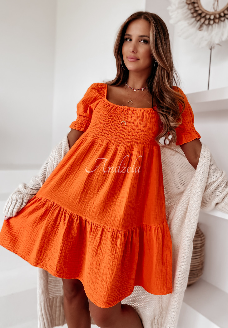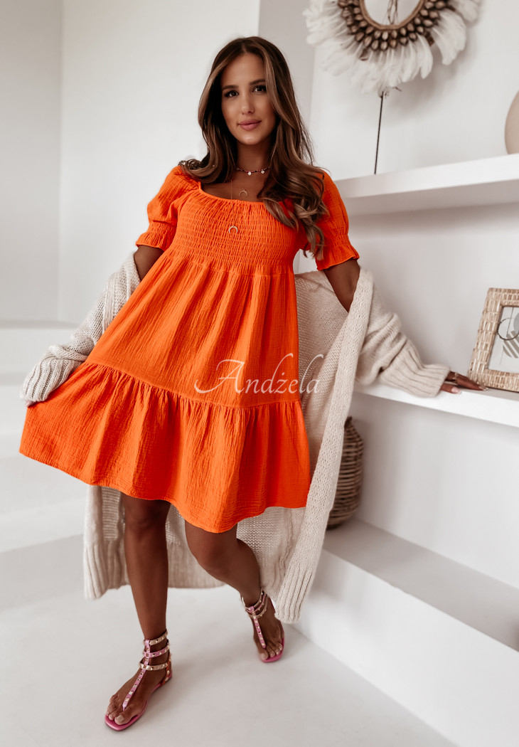Girlish dress, made of muslin fabric, perfect for summer. The model with an elastic crease in the upper part and elastic in the neckline, thanks to which it adapts to the figure. The bottom and short sleeves are finished with frills, giving the whole thing lightness. This proposal is a perfect choice for everyday looks on hot days. This high-quality product is available in several color variants.