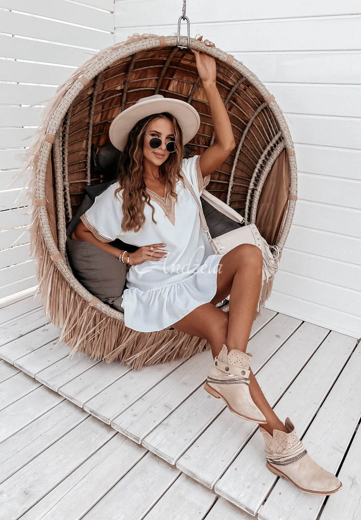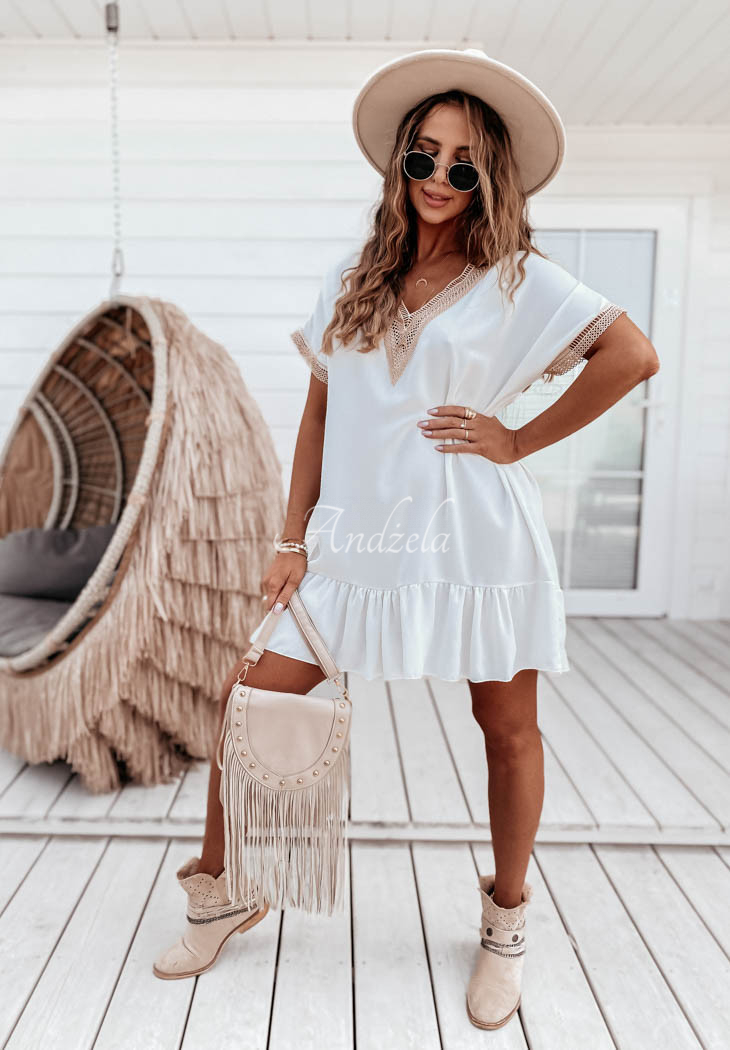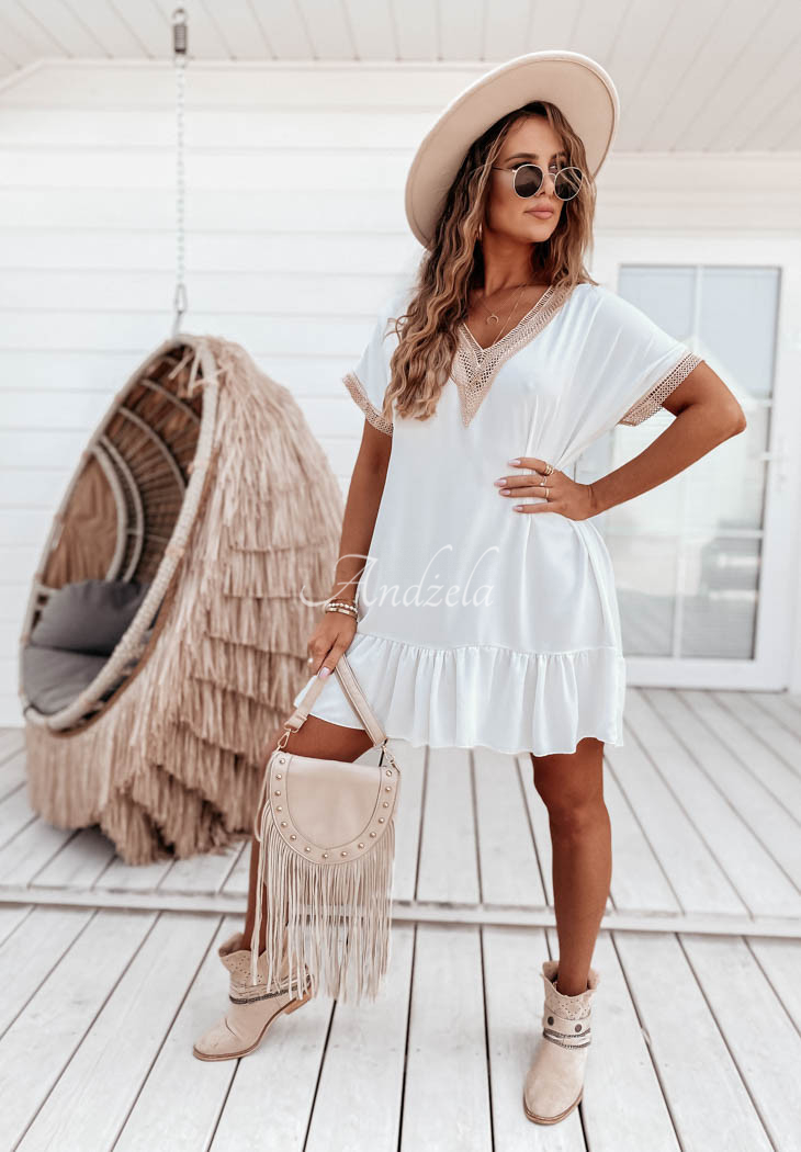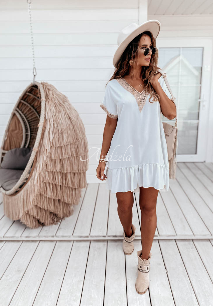 A flowing dress with a frill at the bottom will be perfect for styling on hot summer days. The model with a deep neckline is distinguished by openwork piping in the upper part and at the end of the sleeves. Oversized cut, as well as thin material will give the whole a light and girly look. Available in two color versions.