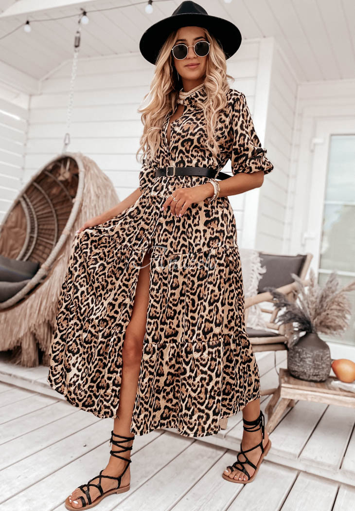 The dress in a fashionable leopard-print pattern is a proposal ideal for various occasions. It was made of smooth material, similar to satin. It comes with a belt, which will be great for accentuating the silhouette. The model is buttoned and has long adjustable sleeves. The bottom is finished with a ruffle, giving the whole thing an airy look. This is an option that will look phenomenal when paired with sandals in holiday loos.