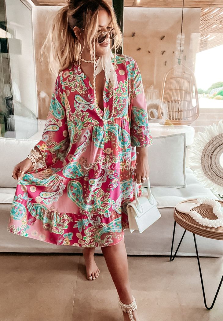 This uniquely patterned dress is a great base for airy everyday looks. It is buttoned, has 3/4 length sleeves, which, like the hem, are finished with a frill. The oversize cut will work fantastically on different body types. The product is made of high-quality material, and is available in several patterns.