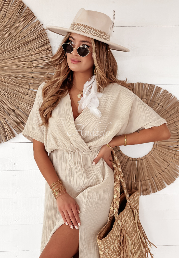 Cotton dress made of high-quality muslin fabric is a proposition that will work in any spring-summer closet. An extremely feminine midi length model with an envelope neckline and a slit on the side. It has short sleeves, and at the waist there is an elastic band, thanks to which the whole thing fits perfectly to the figure.