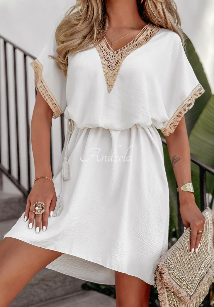 A lightweight dress distinguished by subtle lace accents is a proposal perfect for boho looks. Model with a short, trapezoidal cut with sleeves. In the front there is a feminine heart-shaped neckline, the set also comes with a braided belt, which perfectly completes the styling. The whole piece will blend phenomenally into any summer closet.