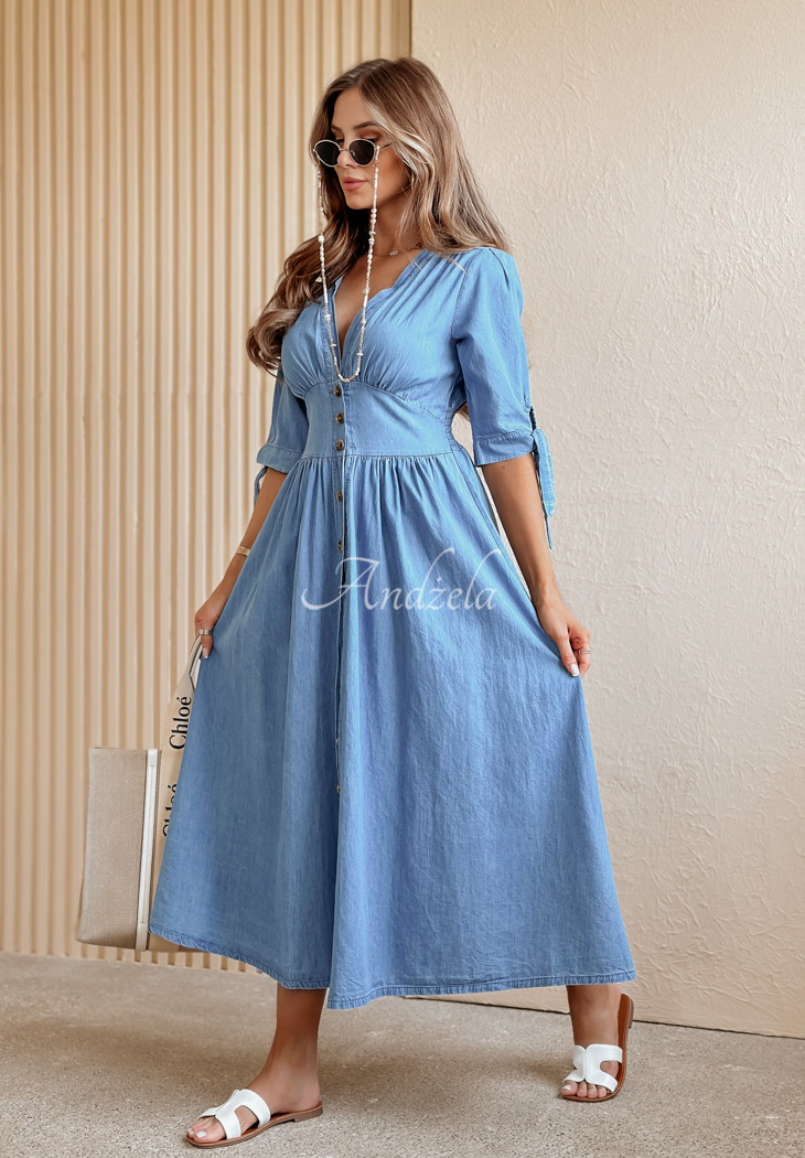 A long denim dress made of cotton fabric is a perfect base for many looks. The model with a deeper neckline has 3/4 sleeves with binding and is buttoned. An additional advantage is the elastic band on the back, which will adjust the material to your figure.
