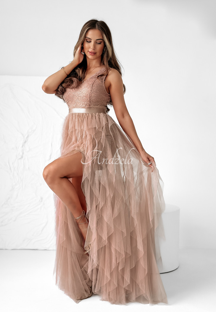 A long dress made from a combination of lace fabric and asymmetrically cut tulle fabric. The model with a deeper neckline in the front and back has wider straps. An additional asset is the elastic waistband, which will emphasize and highlight your figure.