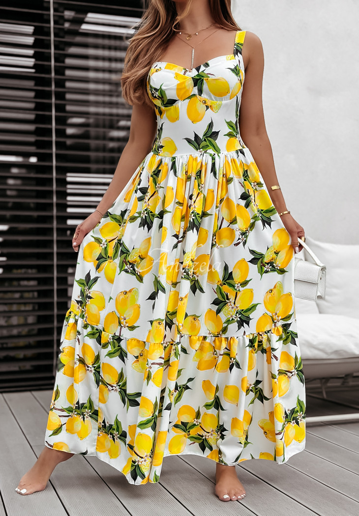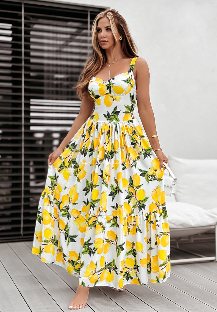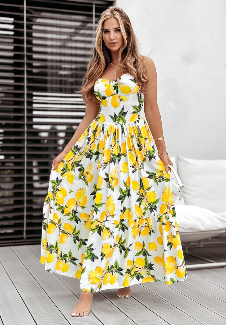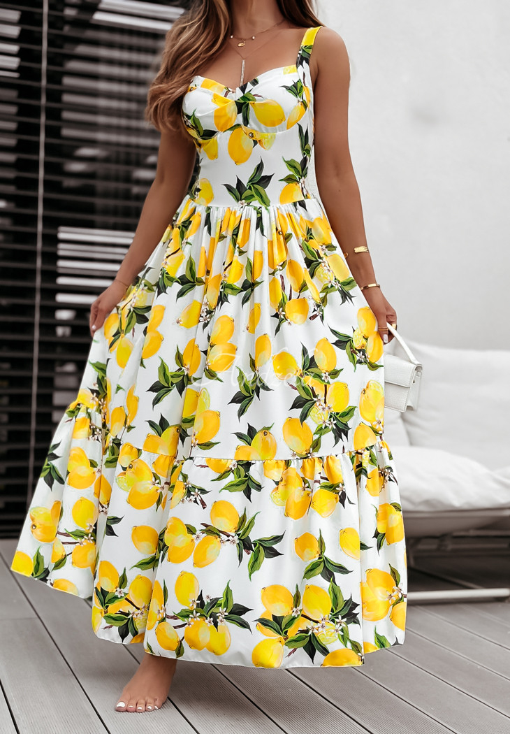The holiday-patterned dress is a proposal that will perfectly complement any summer closet. It stands out with a girlish ruffle at the bottom, giving the whole thing a charming look. It is a maxi length model on non-adjustable straps. It has padded cups, as well as an elastic crease at the back, allowing for a perfect fit.