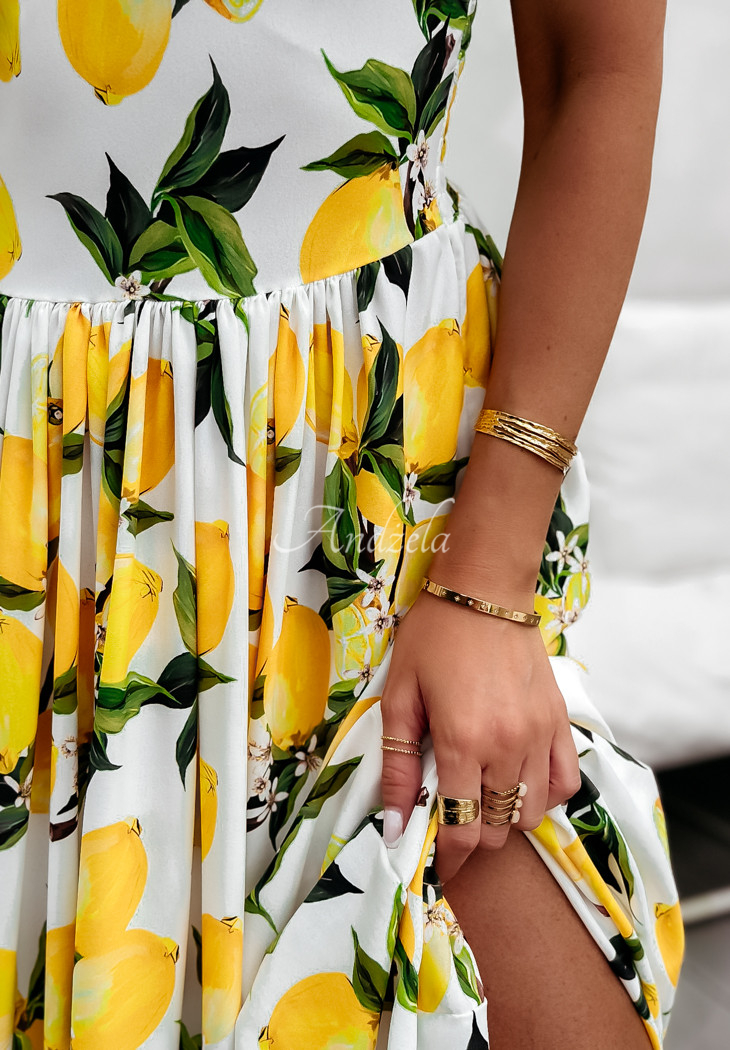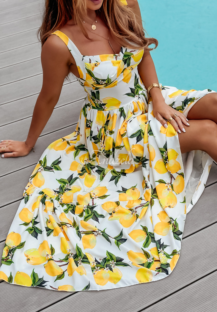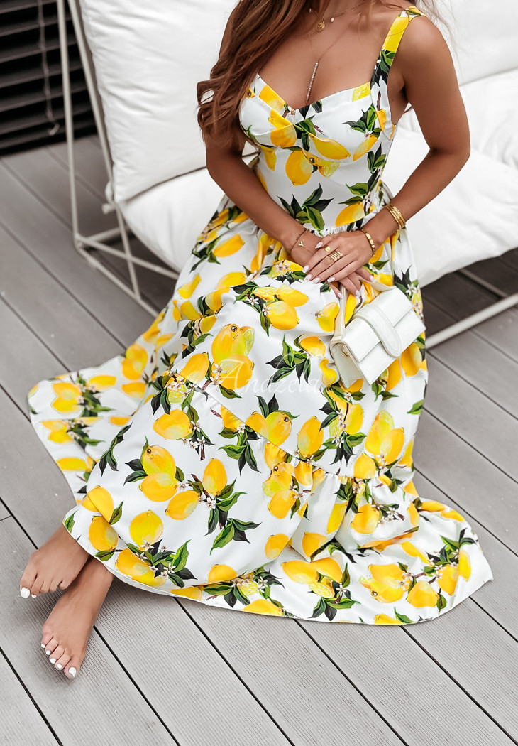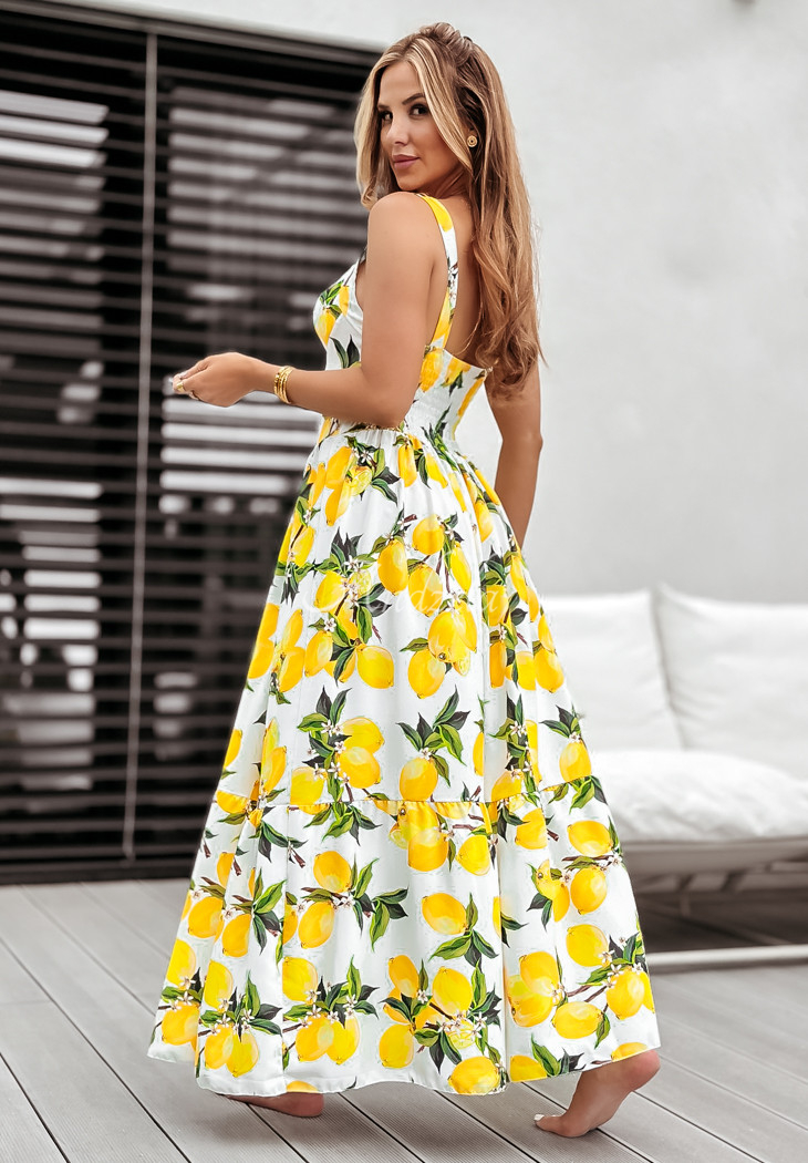 The holiday-patterned dress is a proposal that will perfectly complement any summer closet. It stands out with a girlish ruffle at the bottom, giving the whole thing a charming look. It is a maxi length model on non-adjustable straps. It has padded cups, as well as an elastic crease at the back, allowing for a perfect fit.