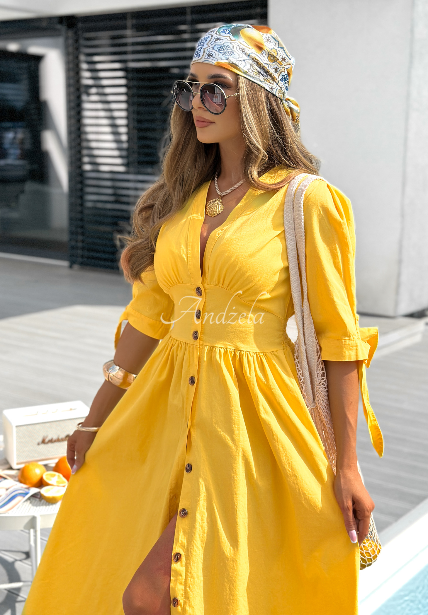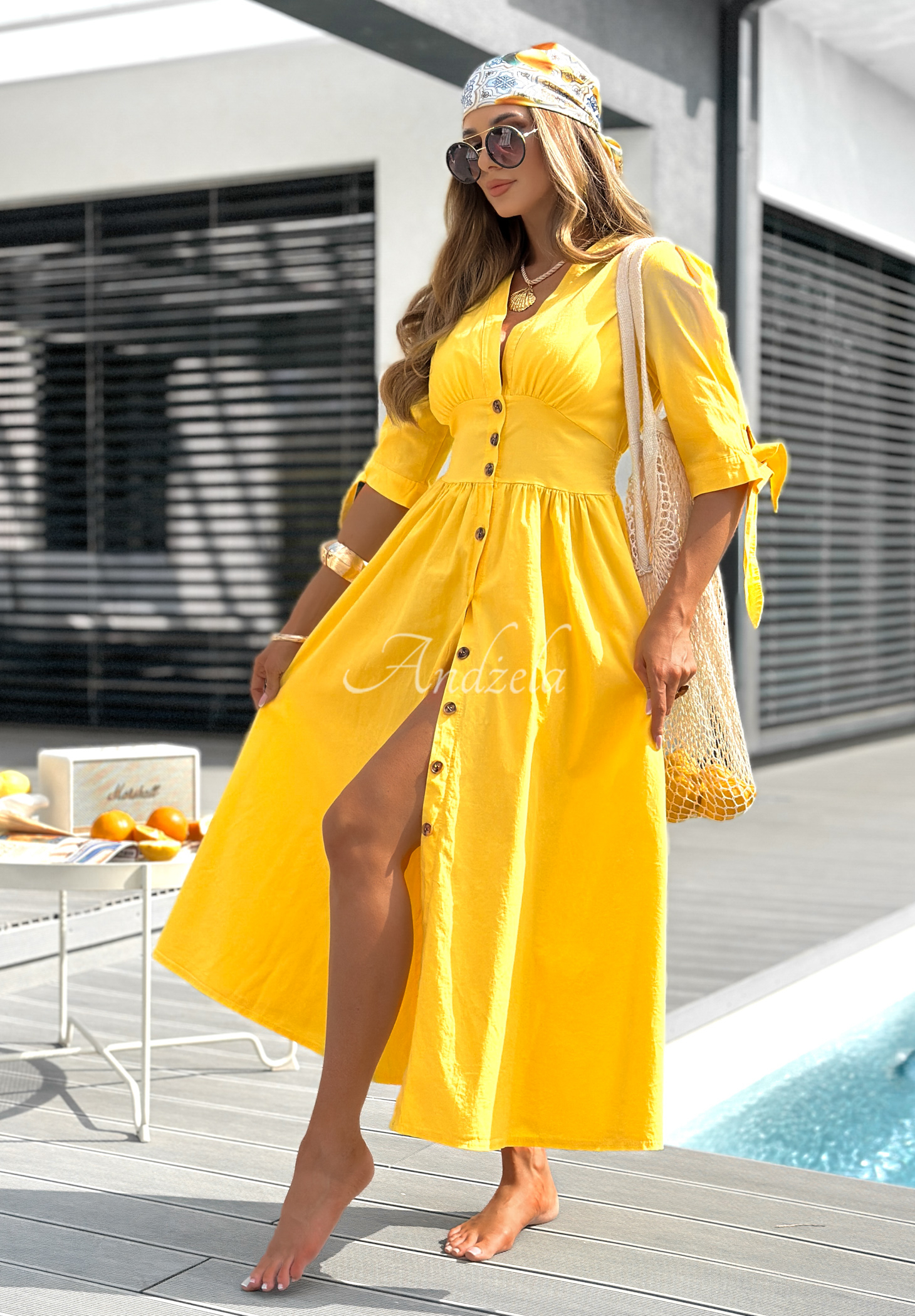 The maxi dress is made of high-quality cotton fabric. It is a model with a heart neckline, having short sleeves with a tie. It is fastened with buttons located along the entire length. At the back it has an elastic waistband.
