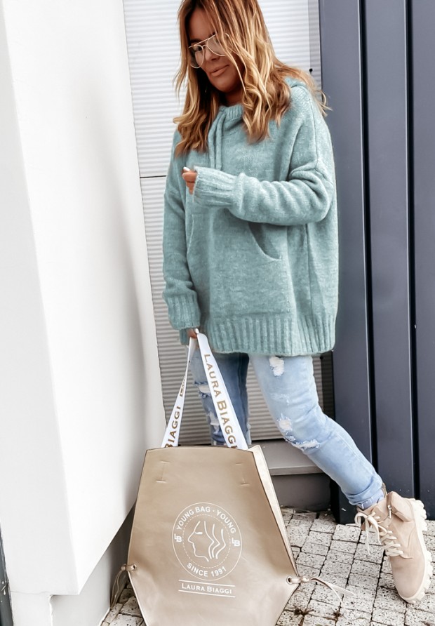 A loose sweater sewn from a soft, pleasant-to-touch knit fabric. The model has a drawstring hood, ribbed sleeves and a large pocket on the front. Available in several color variations. Designed by ANDŻELA!