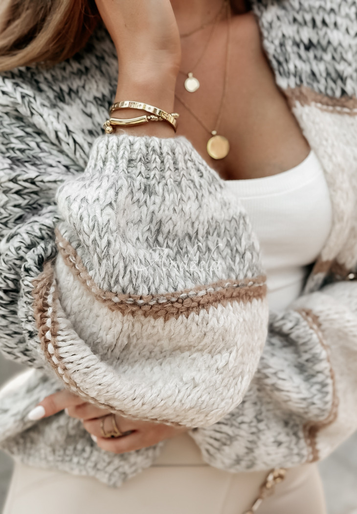 A striped cardigan with high-quality fabric is a perfect choice for colder days. It is an oversized model with beautiful, buff sleeves, finished with ribbed cuffs. The whole look is really impressive and will be perfect for any woman's closet. Available in both short and long versions.