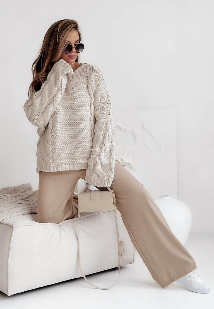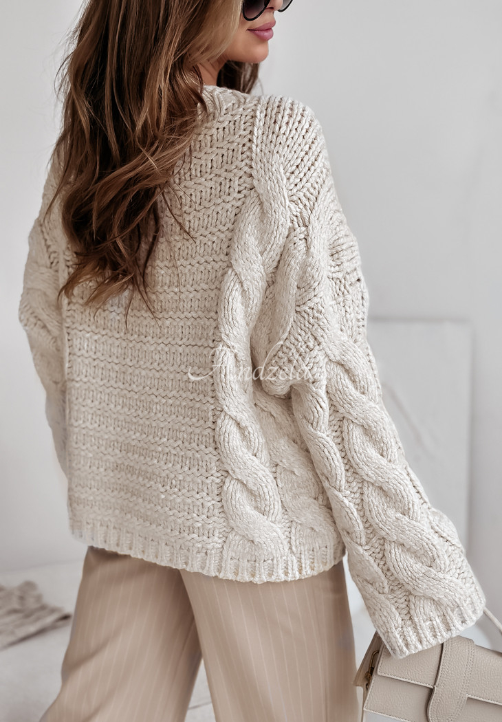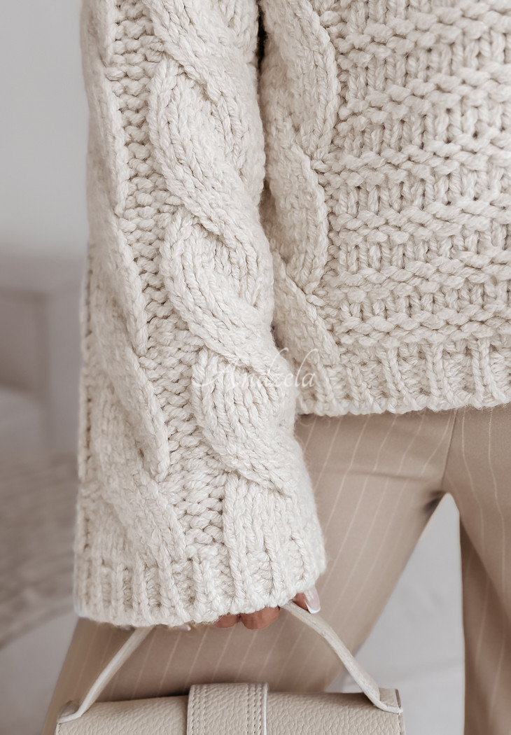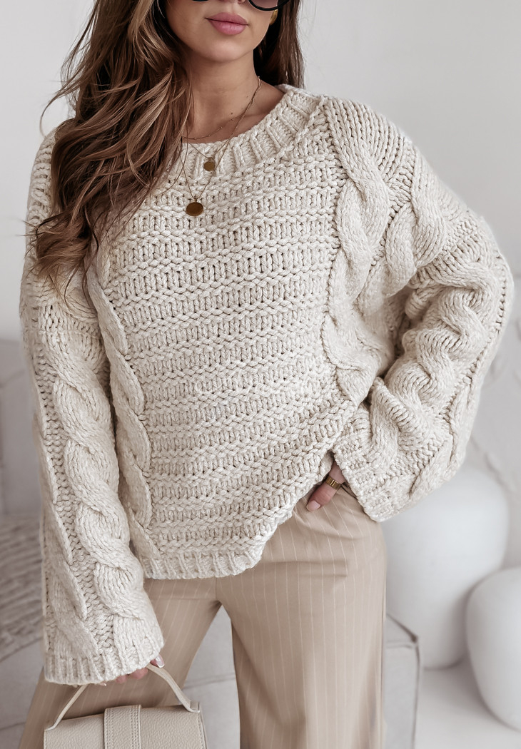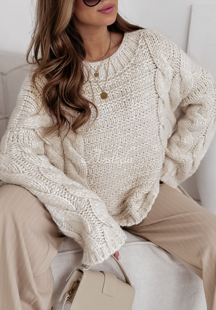The sweater with decorative weave is a great choice for many stylings on cold autumn and winter days. The model with a rounded neckline features wide sleeve ends for an original look.
