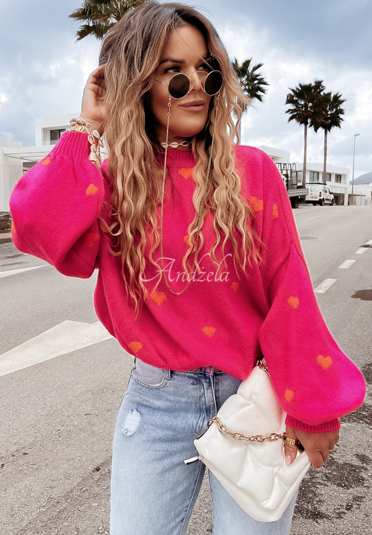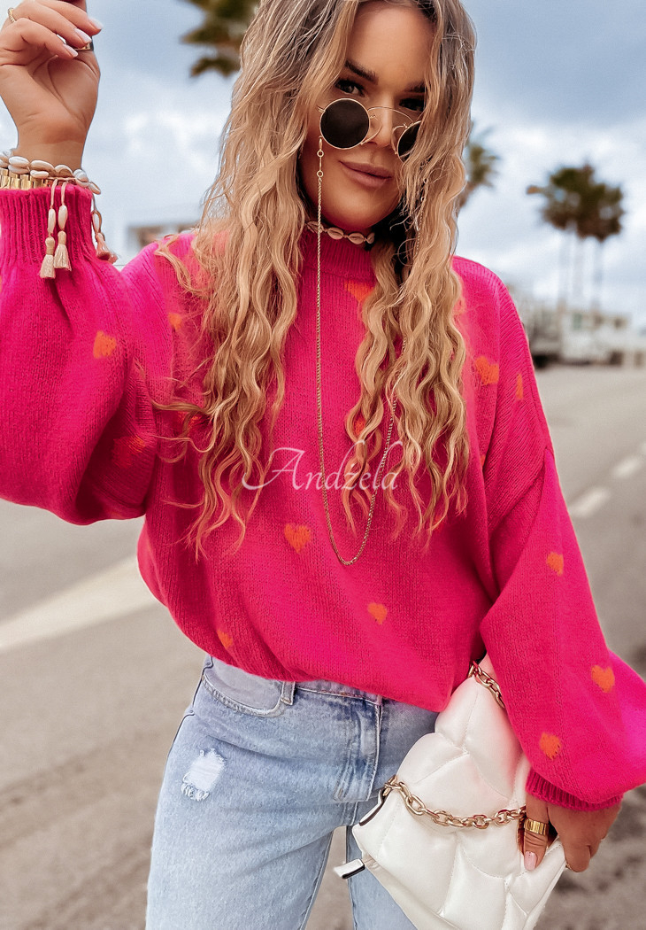 Cute sweater with a heart motif. It is an oversize cut model, has a round neckline, and ribbed cuffs and bottom.* stretch fabric* oversize cut* heart motif* round neckline* ribbed cuffs and bottom