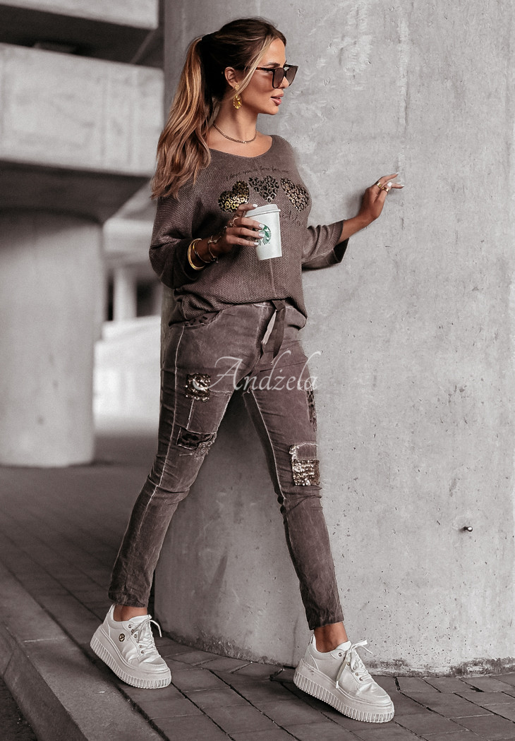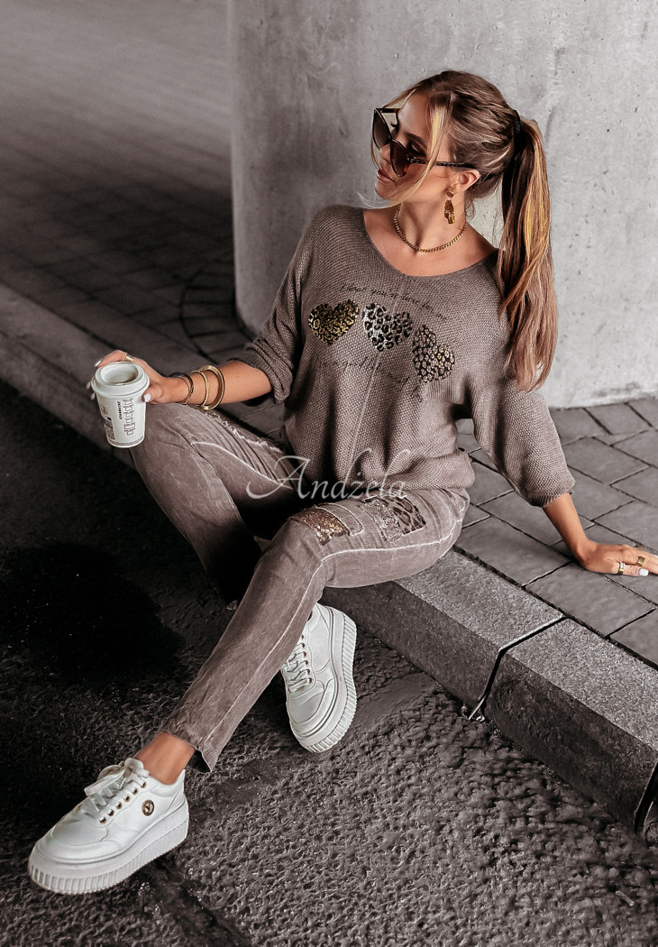 A remarkably lightweight sweater made of high quality material is an option that will work in any closet! It is distinguished by the print on the front, which is decorated with shiny gilding and silvering. It's a looser-weave model and oversized cut with a slightly longer back. It has 3/4 sleeves, as well as a rounded neckline.