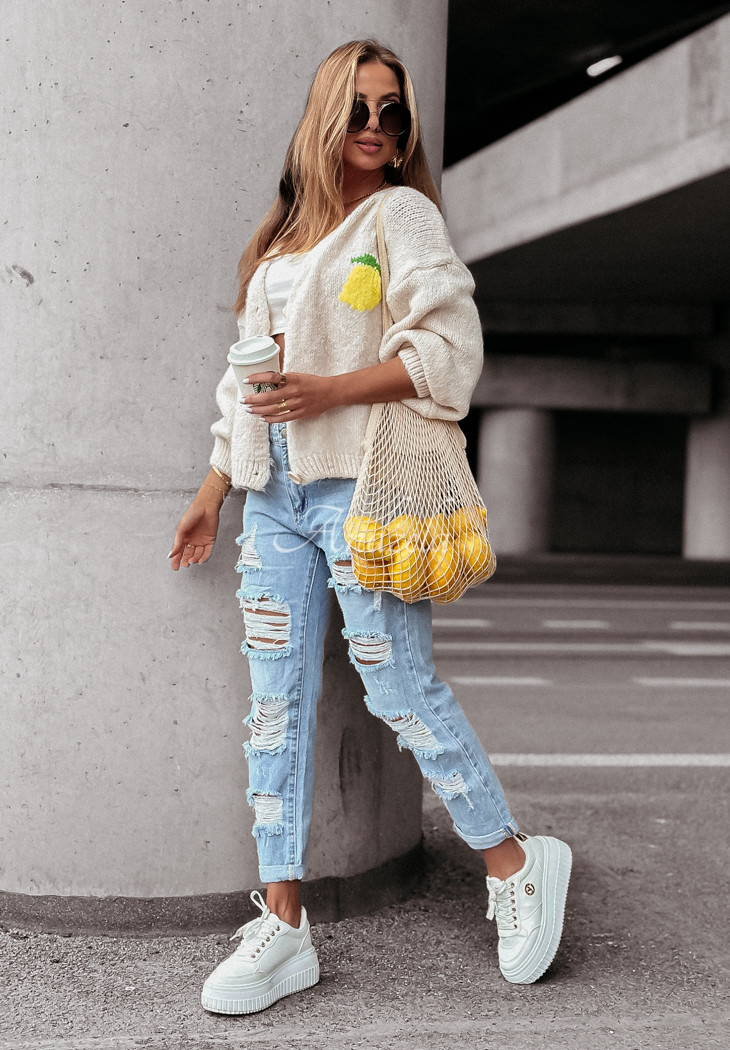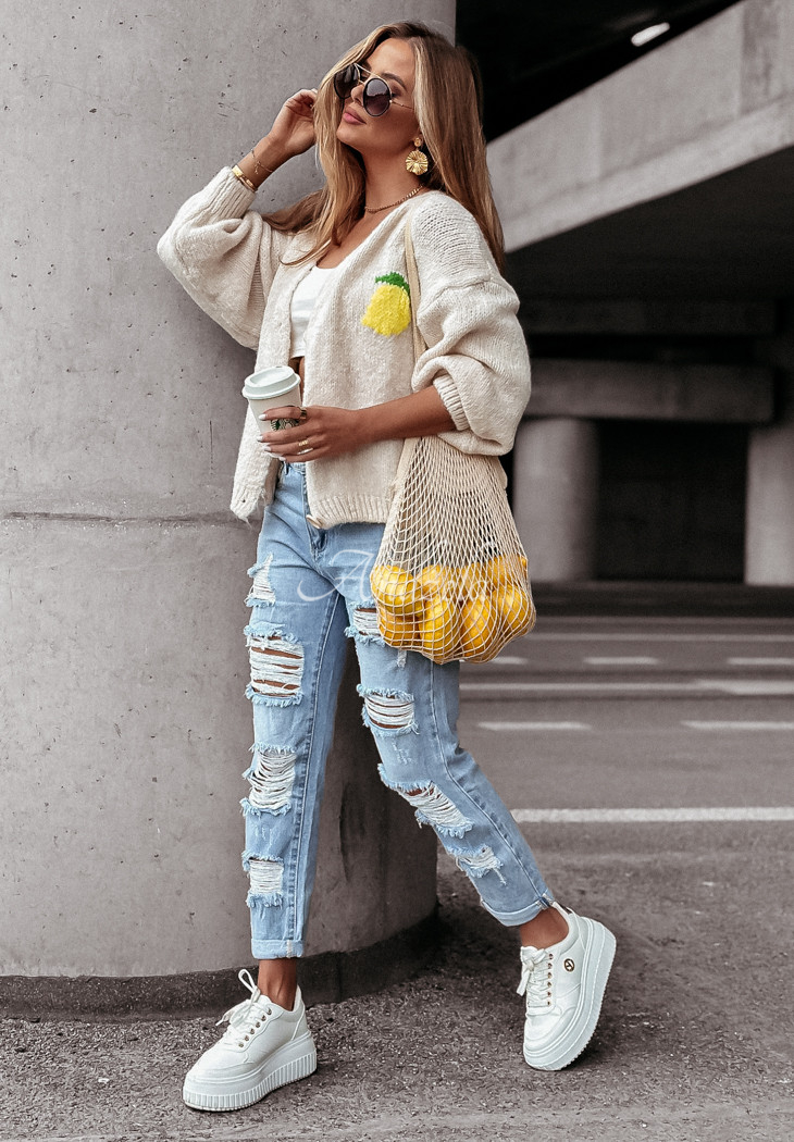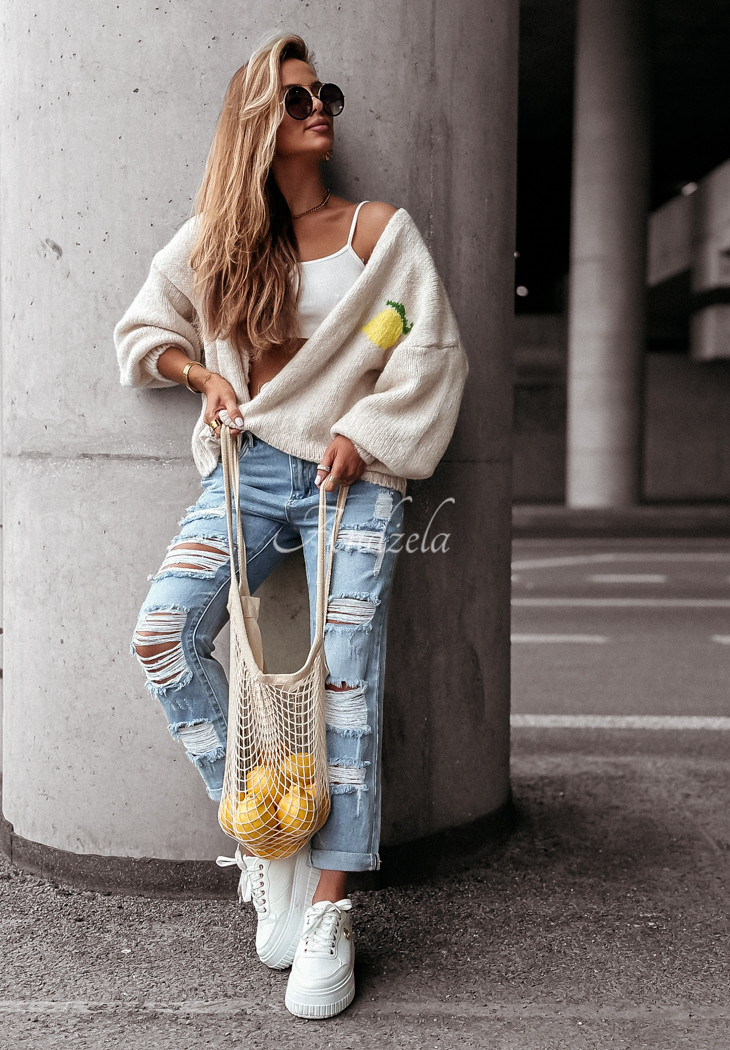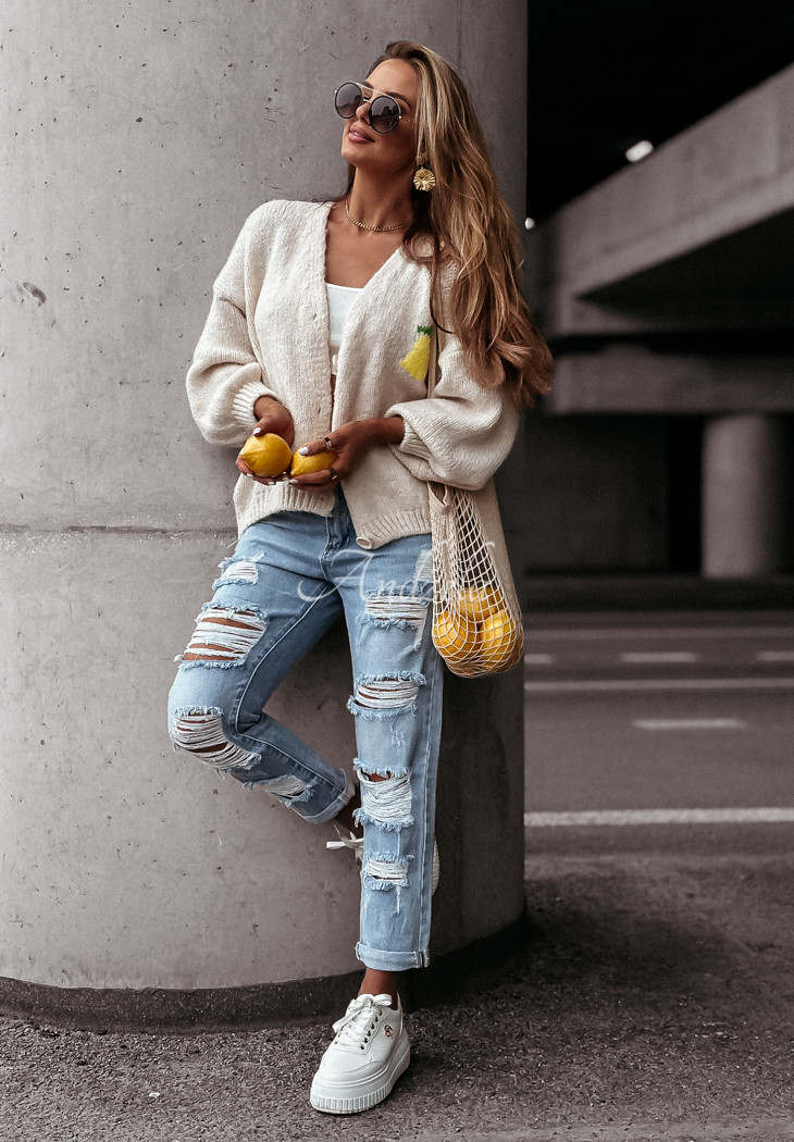 A soft wool-blend cardigan is a great choice for colder days. It is distinguished by decorative embroidered patterns located both on the front and back. It is an oversized cut model with a button closure. It has long sleeves, which, like the hem, are finished with ribbed cuffs.