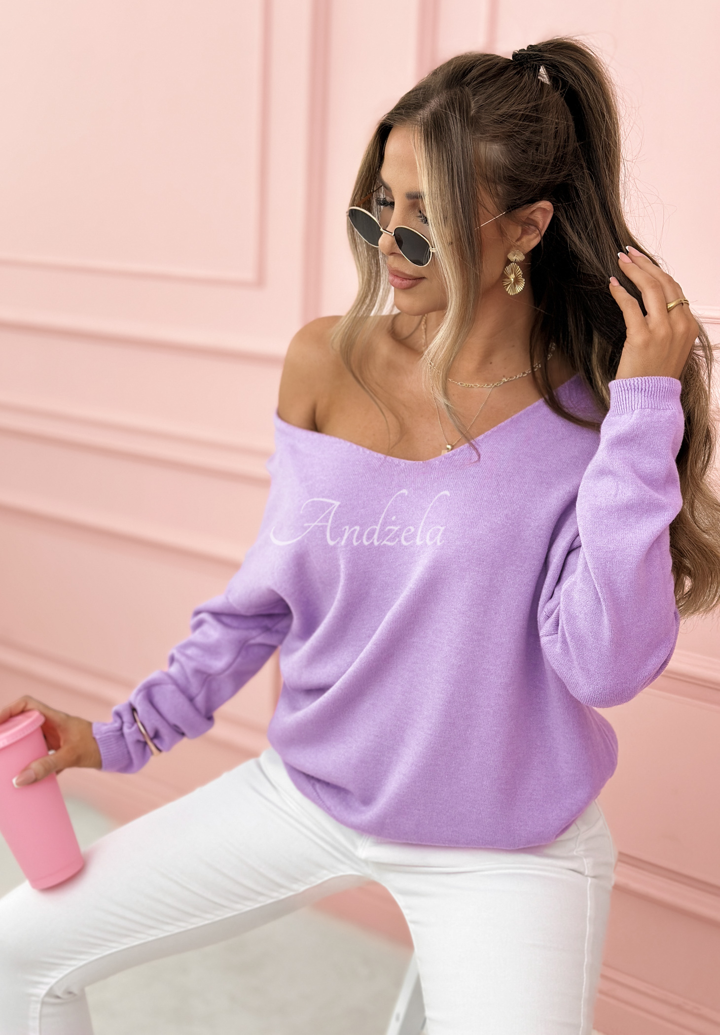Lightweight sweater made of soft and pleasant to the touch material with viscose. It is a model of a more oversized cut with a feminine heart neckline. The long sleeves, like the hem, are finished with ribbed trims.