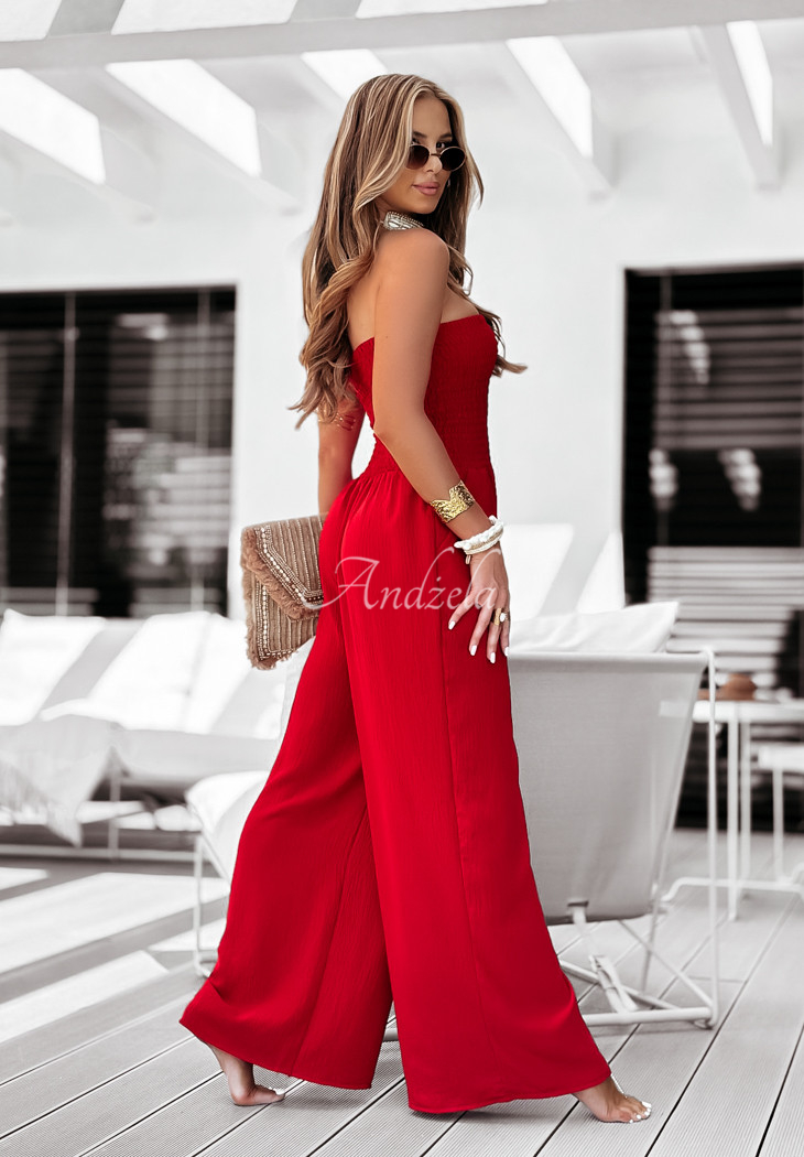 A long jumpsuit made of soft, airy fabric is a perfect choice for many occasions. Strapless model with a wide hem at the top, it also has pockets on the sides. An additional advantage are the wide legs, giving the whole a loose character and lightness.