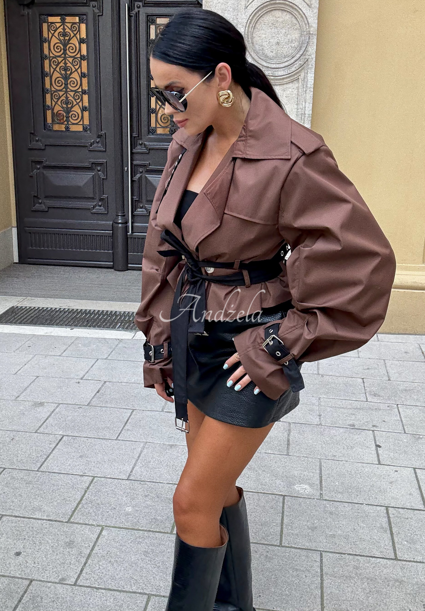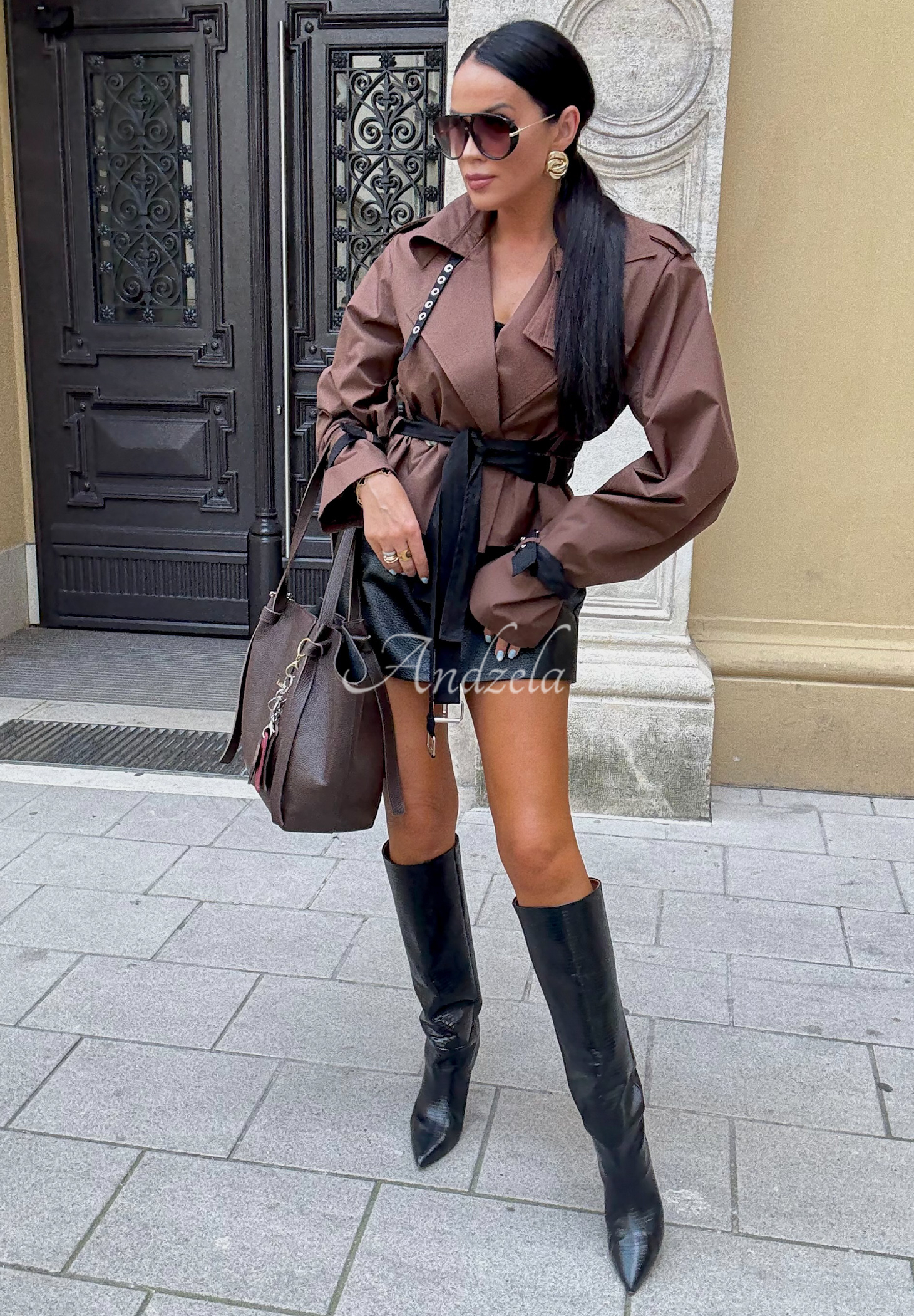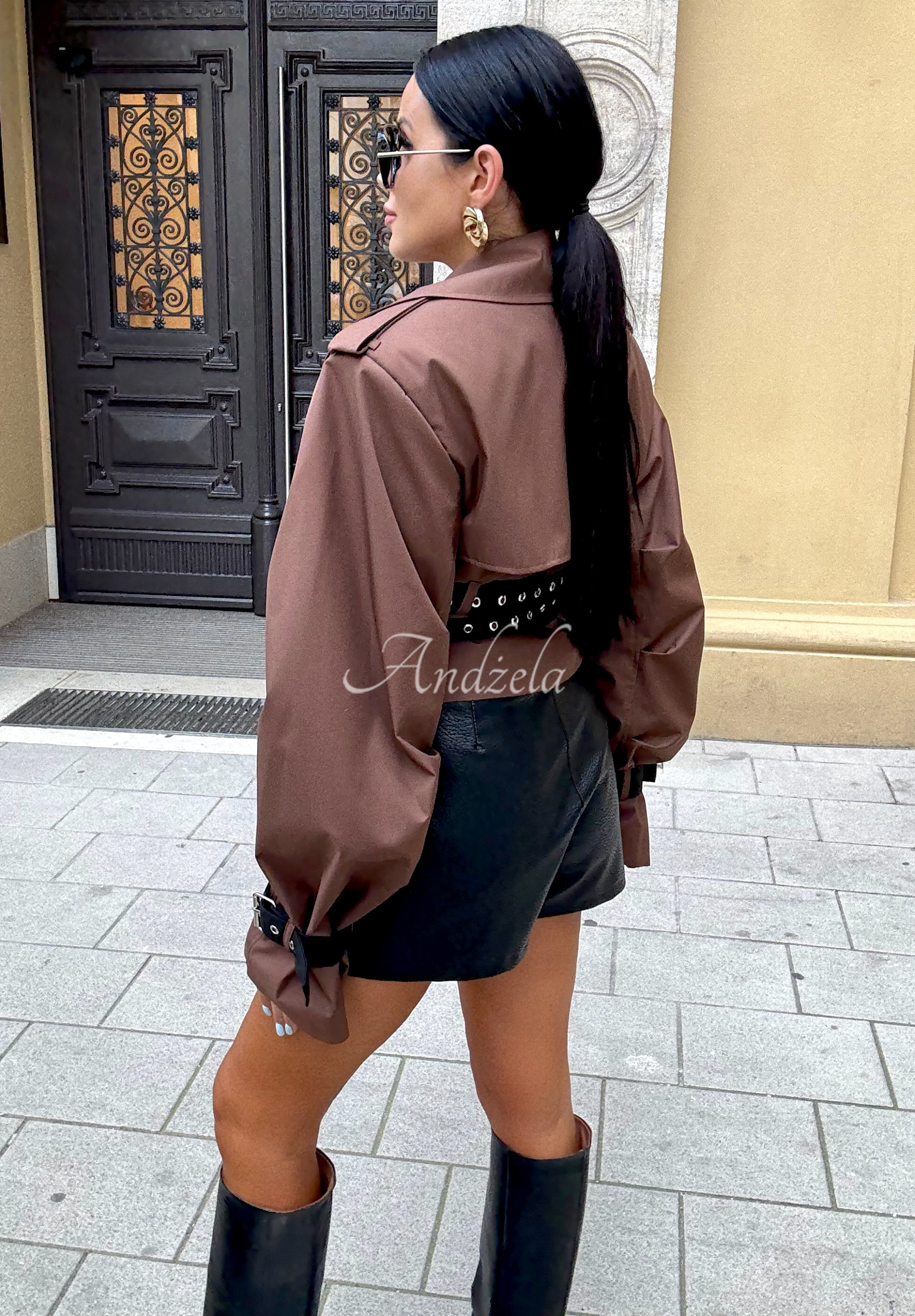 The short trench is a great choice for the transitional season. A proposal with a fashionable cut with a collar and shoulder pads, it is buttoned. It has a lining, and there are fabric stripes at the bottom. The bottom of the sleeves and the collar are also finished with adjustable fasteners.