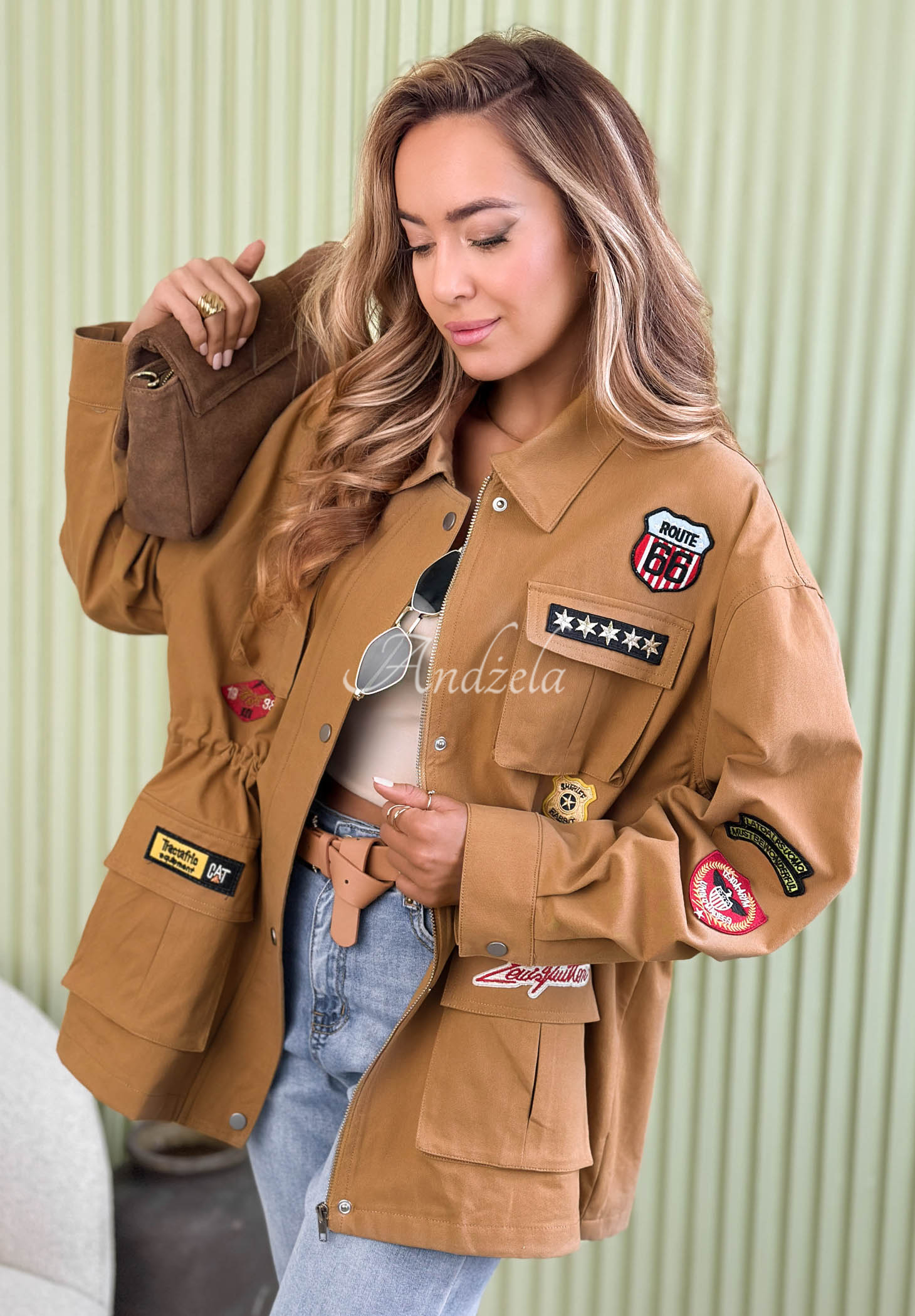 Parka jacket made of cotton fabric. It features a collar and adjustable drawstrings. It stands out with decorative patches and has four functional pockets with flaps. Fastened with a zipper and snaps, its sleeves are finished with cuffs.