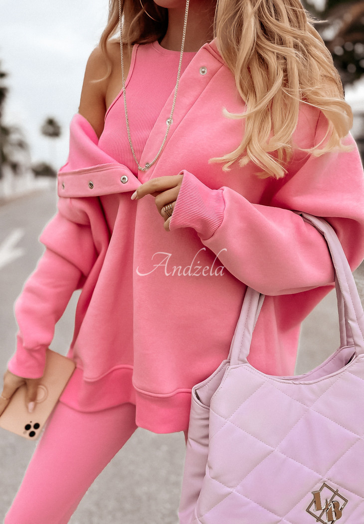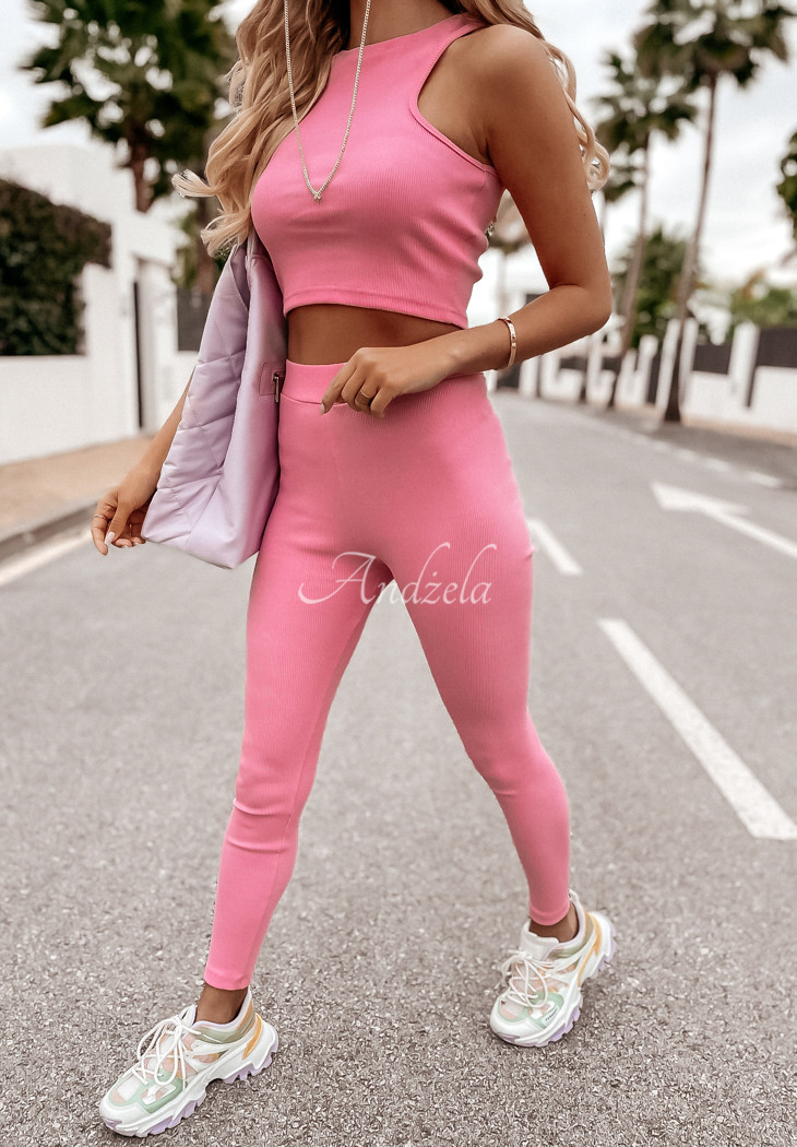 The tracksuit set is a proposal perfect for comfortable looks. The set includes a ribbed top, an oversized hoodie and high-waisted leggings. This is a proposal that will present itself phenomenally as a set, as well as separately.