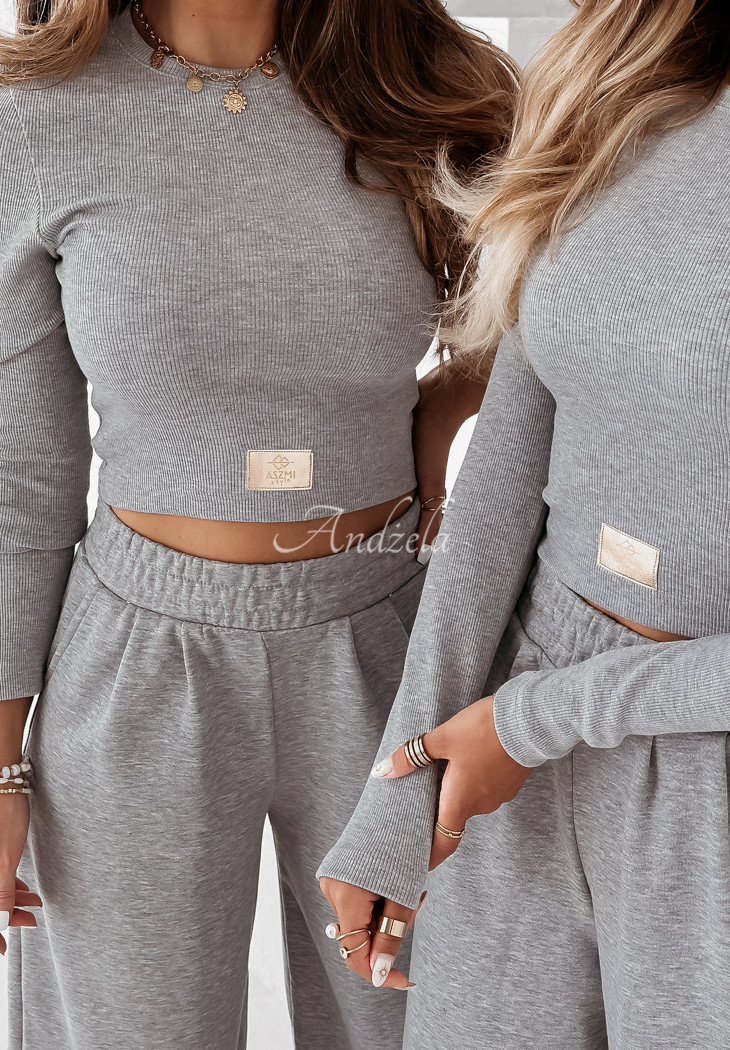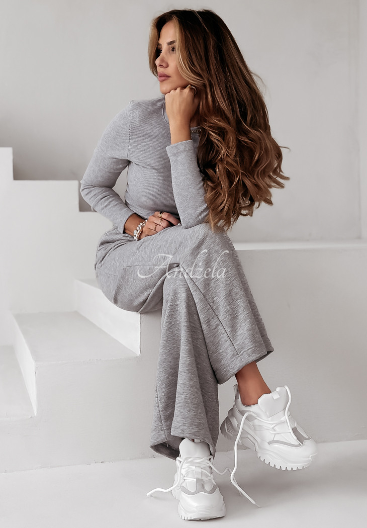 A unique set made of high-quality fabric is a perfect base for many everyday looks. A short, ribbed blouse with a rounded neckline and a patch at the bottom. Pants with elastic waistband and side pockets stand out with wide legs. Available in several color versions.